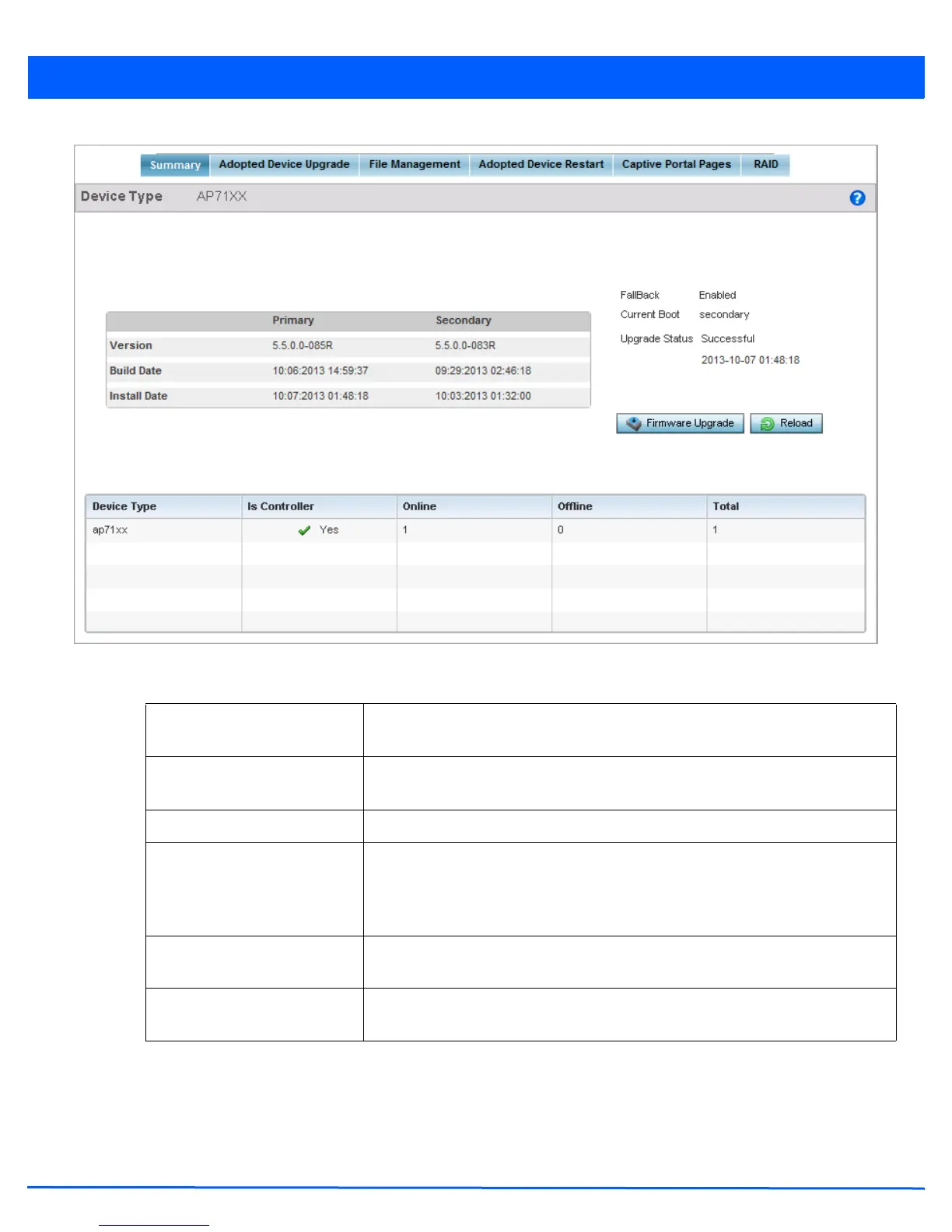 Upgrade Status Displays the status of the last firmware upgrade. For information on upgrading device