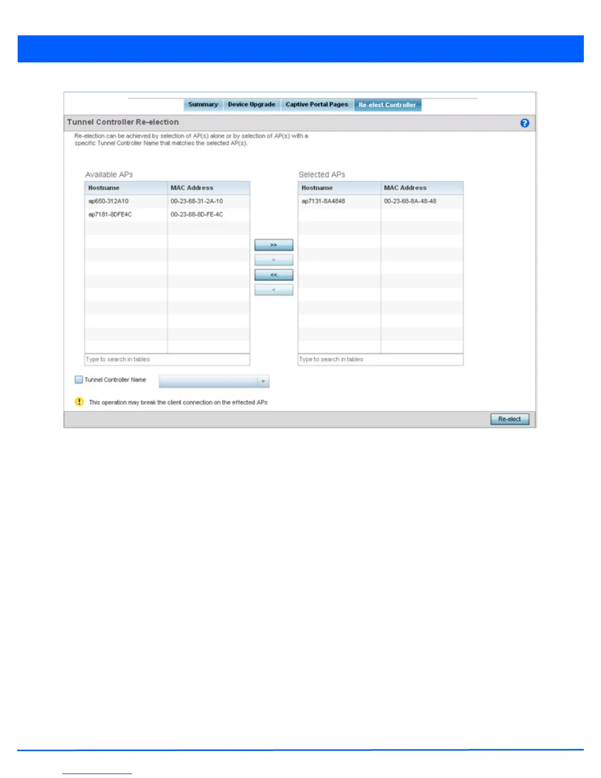 5. Select Re-elect to designate the Selected AP(s) as resources capable of tunnel establishment.