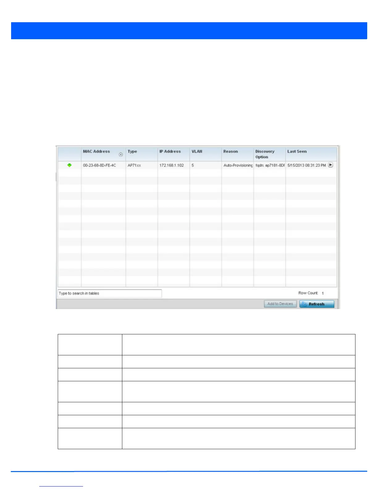 The Pending Devices screen displays those devices detected within the network coverage area, but have yet to be adopted.