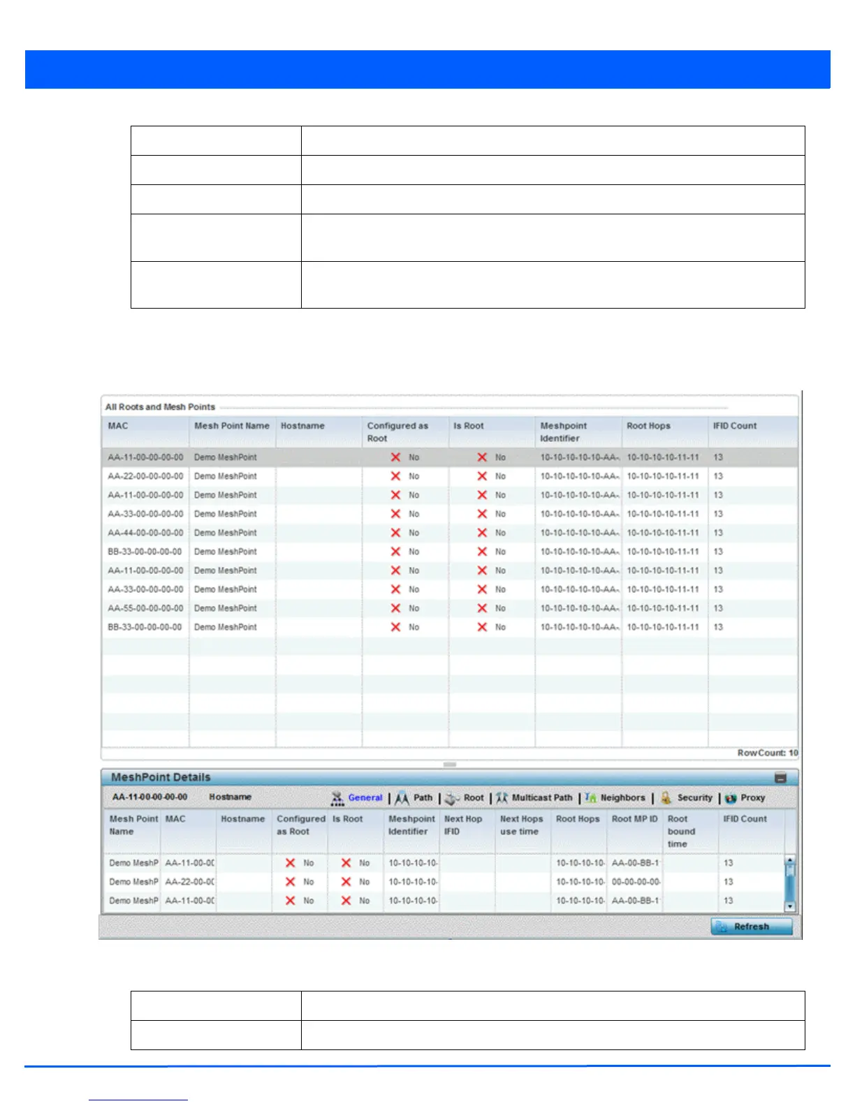 MAC Displays the MAC Address of each configured mesh point in the RF Domain.