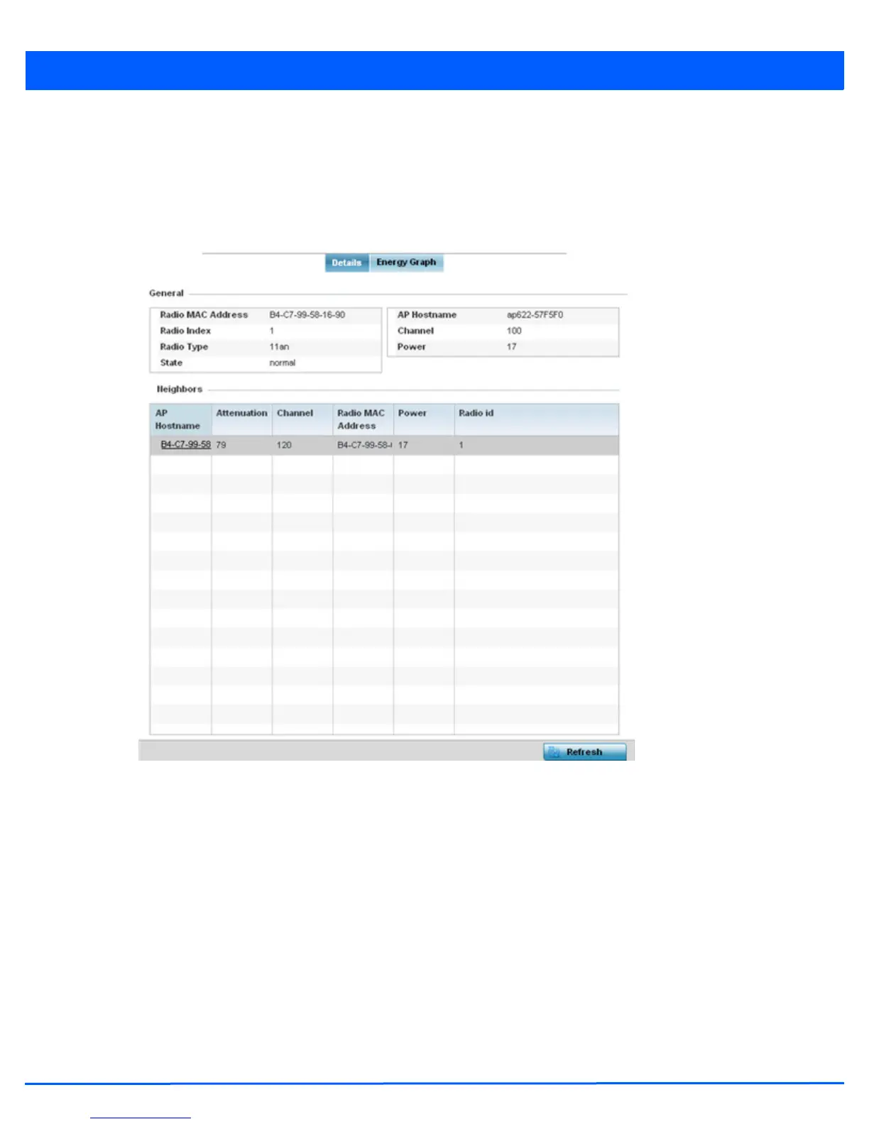 Use the Energy Graph to review the radio’s operating channel, noise level and neighbor count. This information helps
