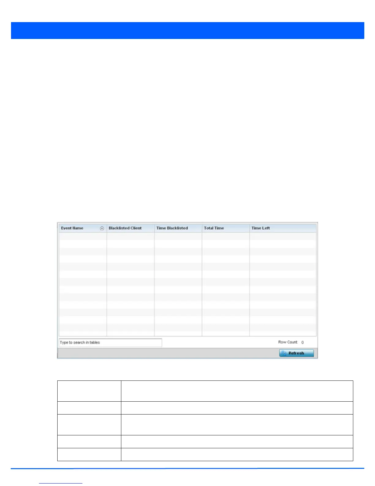 The Client Blacklist displays clients detected by WIPS and removed from RF Domain utilization. Blacklisted clients are not