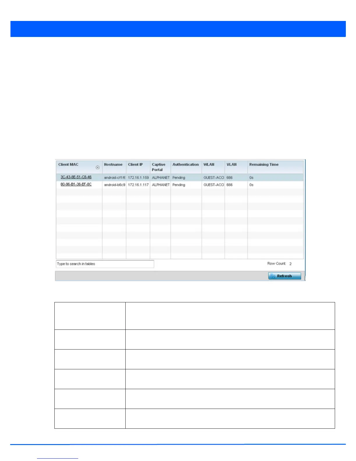 Hostname Lists the administrator assigned hostname of the device requesting captive portal access
