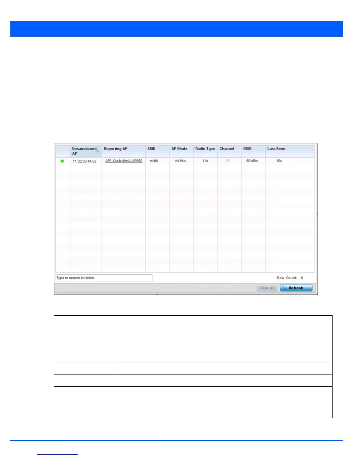 Unsanctioned AP Displays the MAC address of a detected access point that is yet to be authorized for