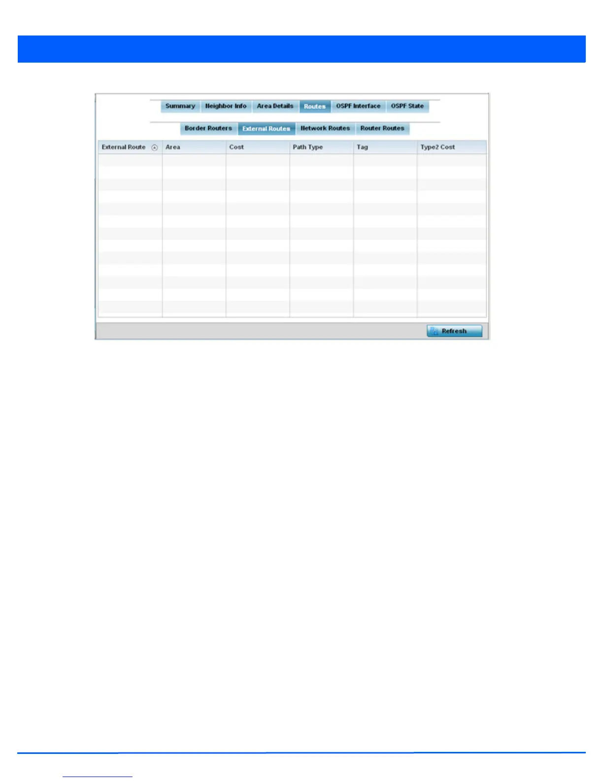 The External Routes tab displays a list of external routes, the area impacted, cost, path type, tag and type 2 cost. Cost