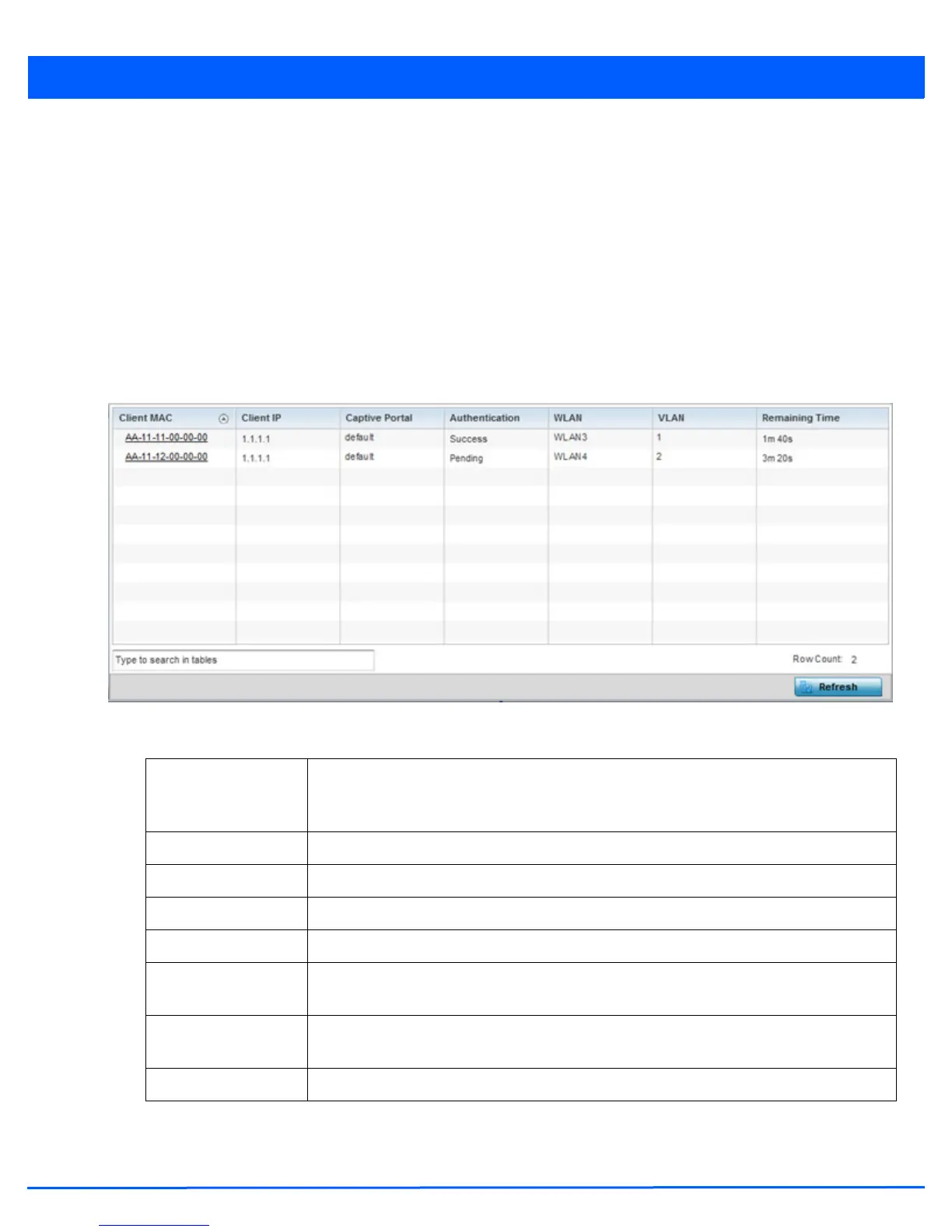 Client IP Displays the IP addresses of captive portal resource requesting wireless clients.