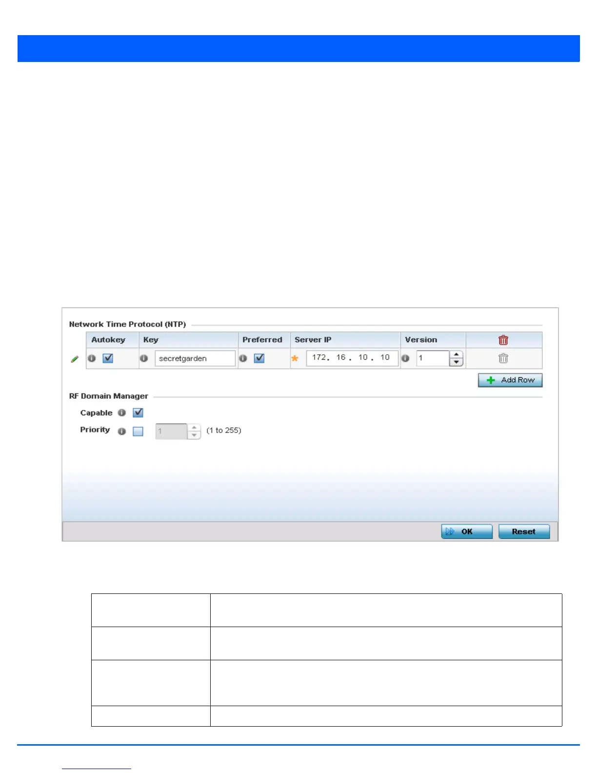 4. Select + Add Row below the Network Time Protocol (NTP) table to define the configurations of NTP server resources used