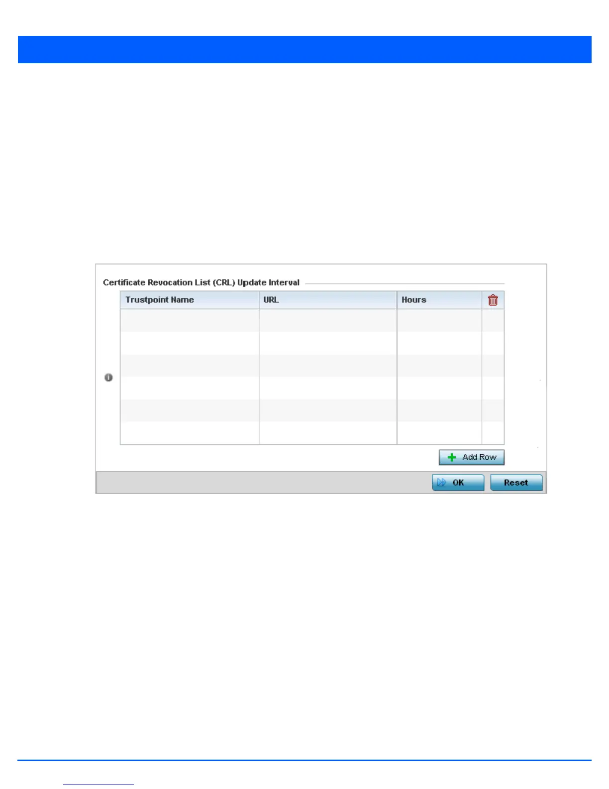 5. Select the + Add Row button to add a column within the Certificate Revocation List (CRL) Update Interval table to