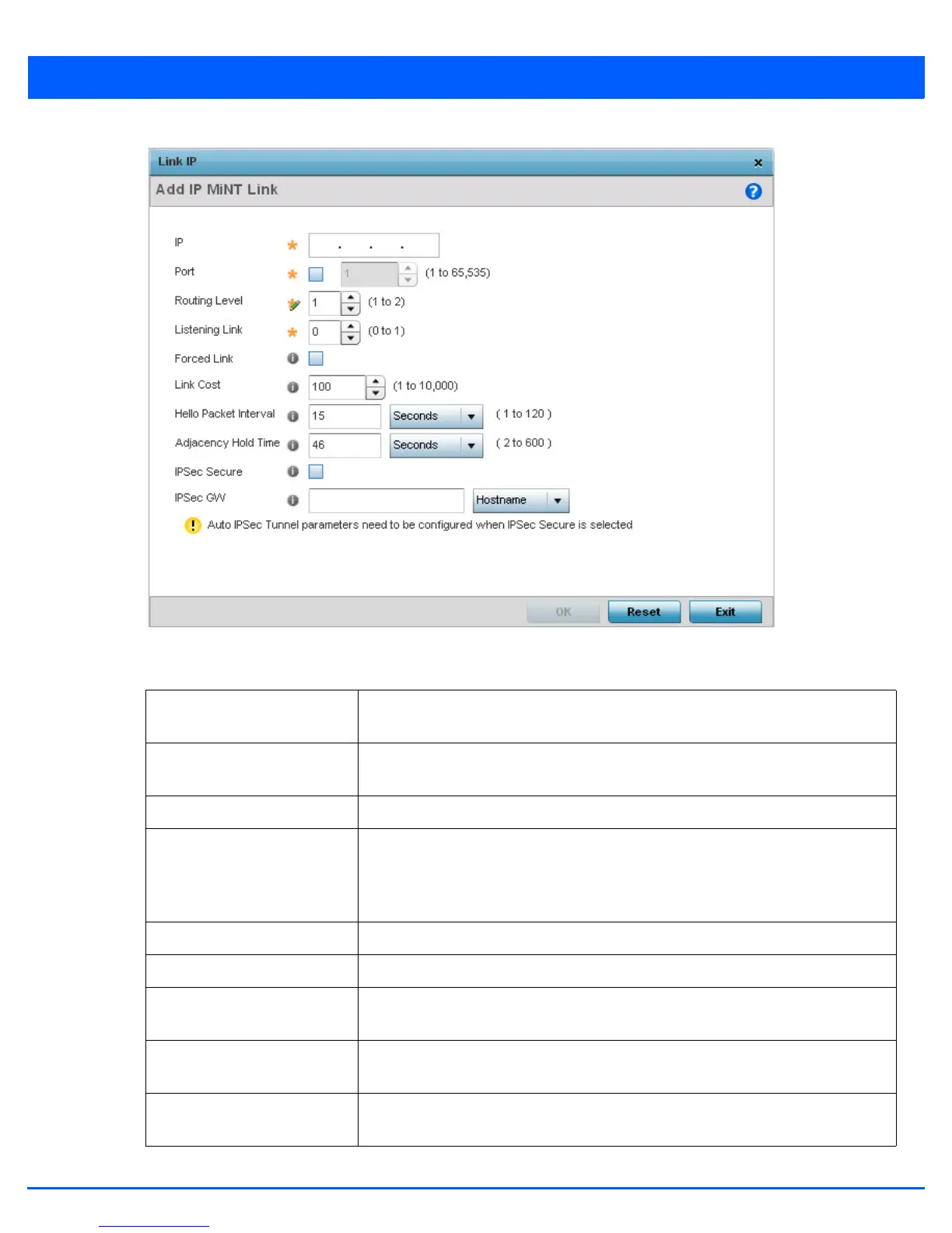 11. Set the following Link IP parameters to complete the MINT network address configuration: