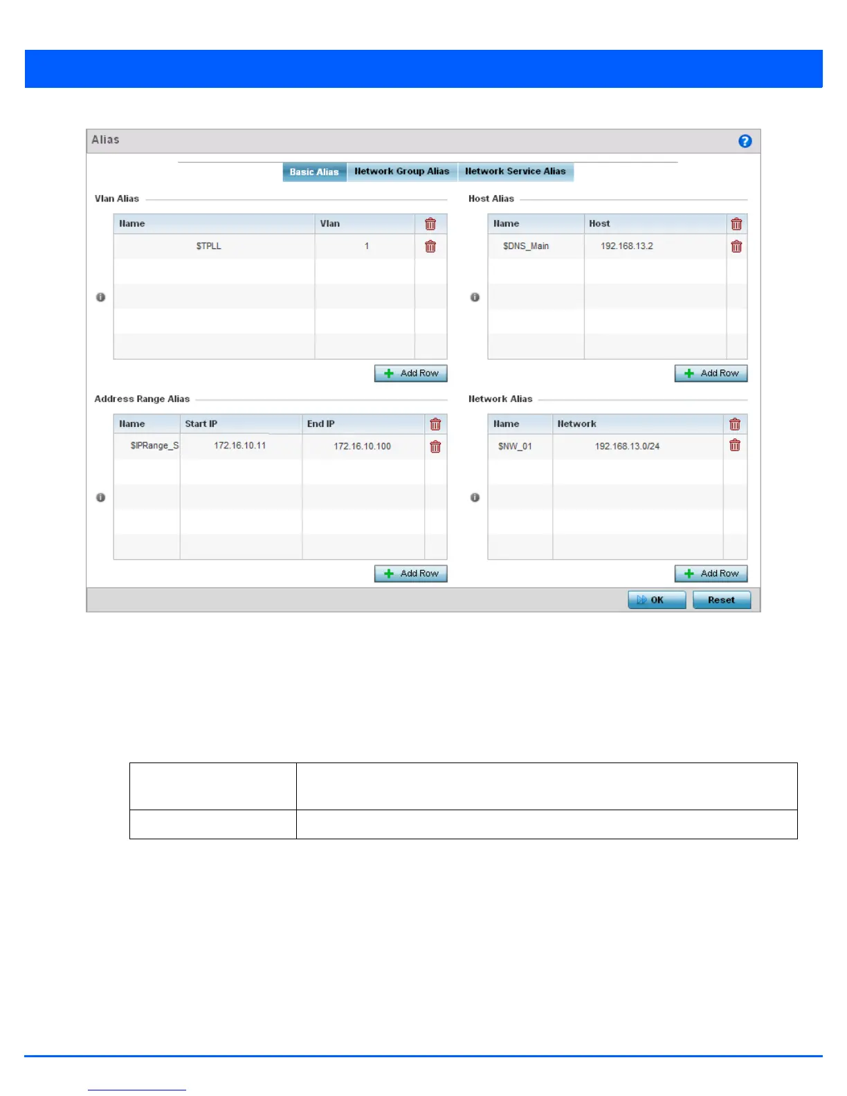 6. Select + Add Row to define VLAN Alias settings.