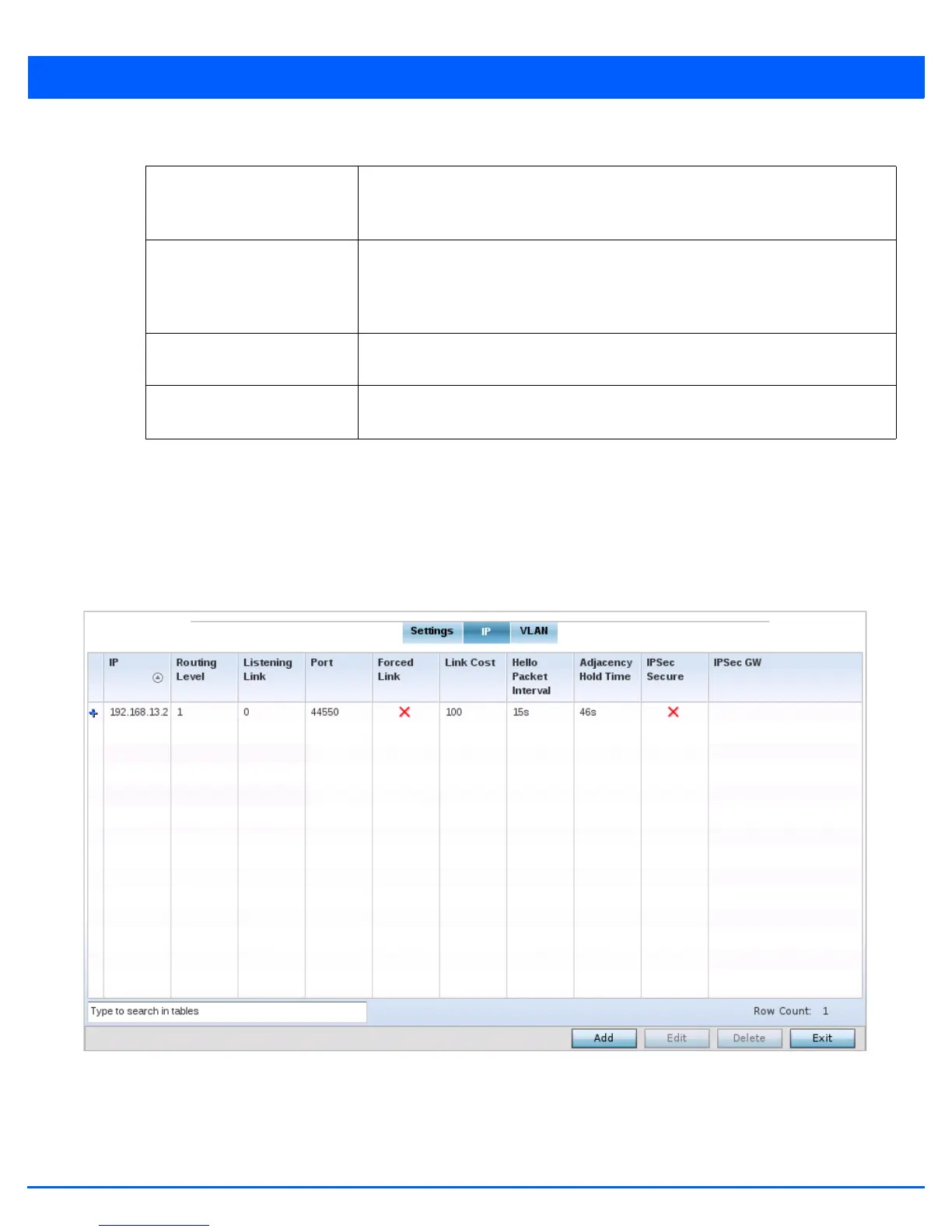 The IP tab displays the IP address, Routing Level, Listening Link, Port, Forced Link, Link Cost, Hello Packet Interval and