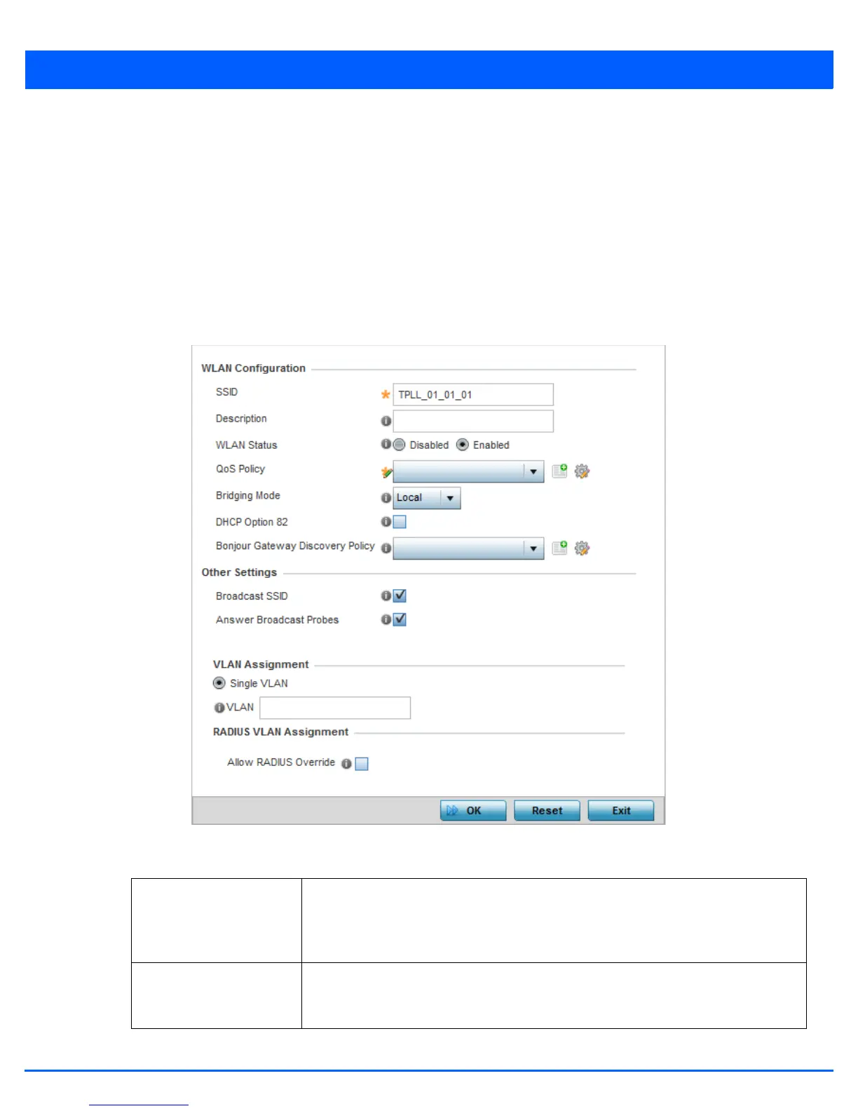 SSID Enter or modify the Services Set Identification (SSID) associated with the WLAN. The