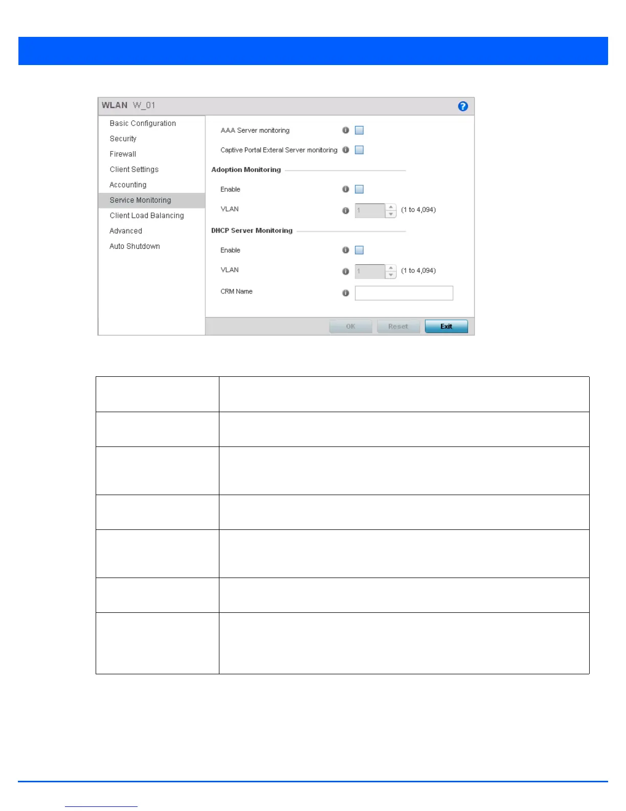 7. Select OK when completed to update this WLANās service monitoring settings. Select Reset to revert the screen back to