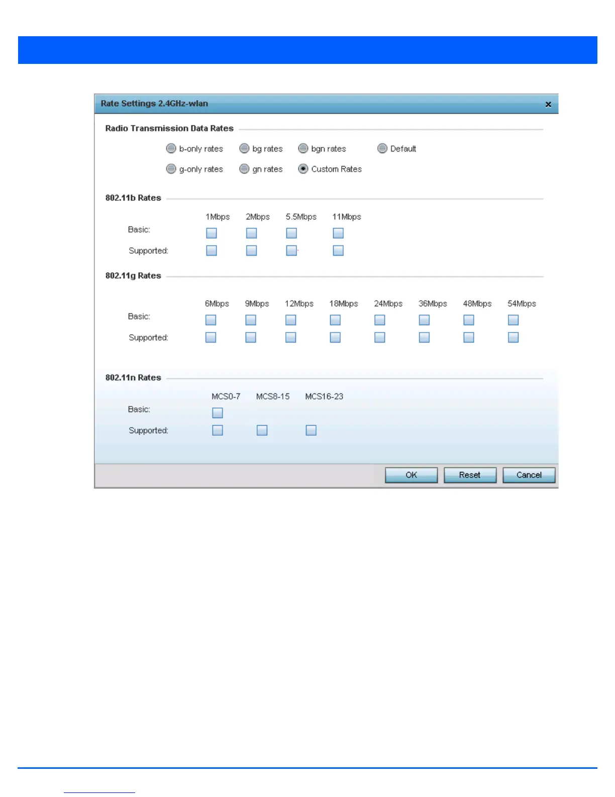 8. For 2.4 GHz WLAN radio transmission rate settings, define the minimum Basic and Supported rates in the 802.11b Rates,