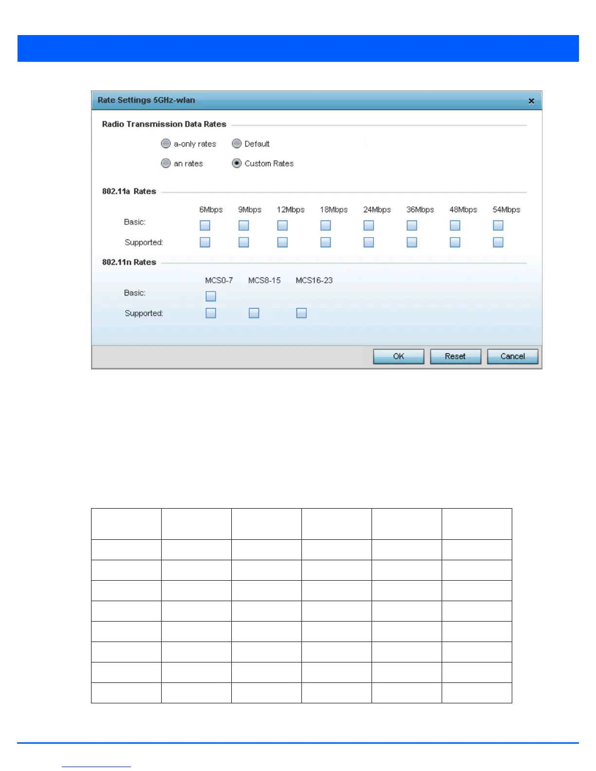 If supporting 802.11n, select a Supported MCS index. Set a MCS (modulation and coding scheme) in respect to the radio’s