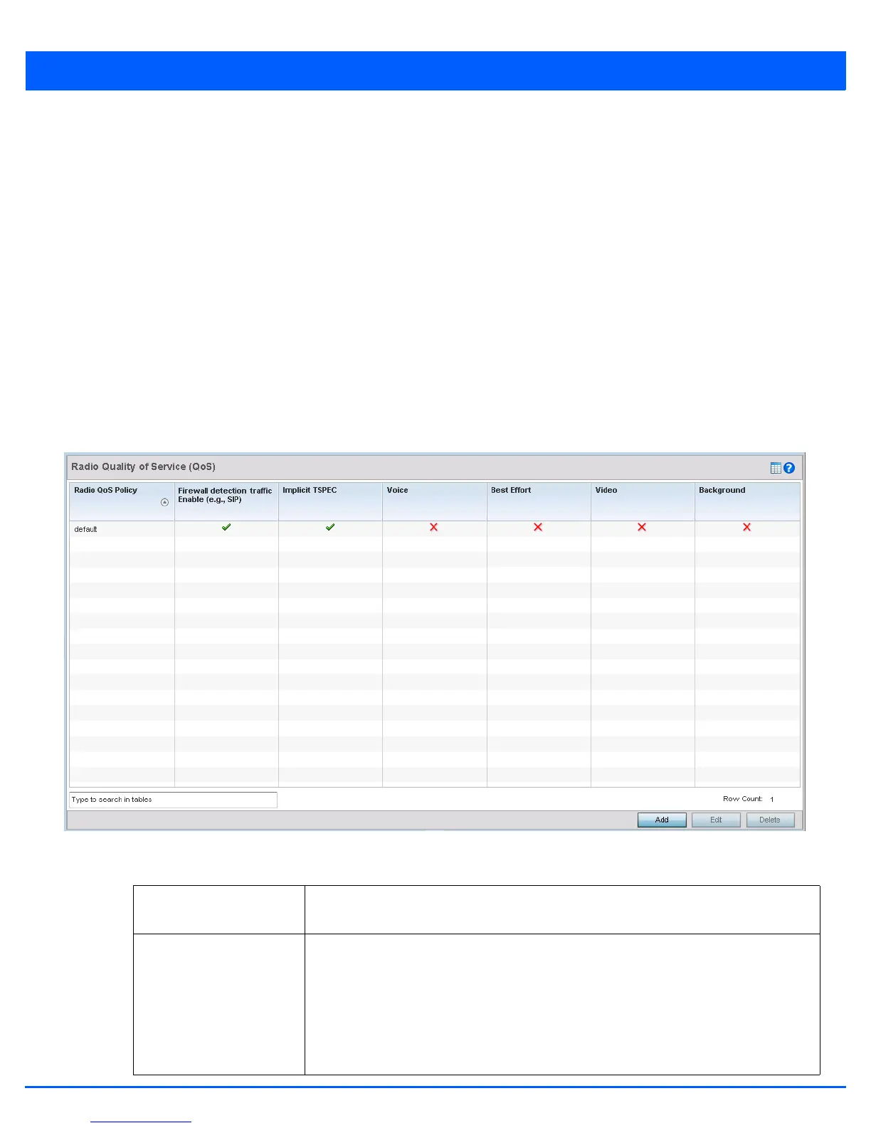 Radio QoS Policy Displays the name of each radio QoS policy. This is the name set for each listed policy