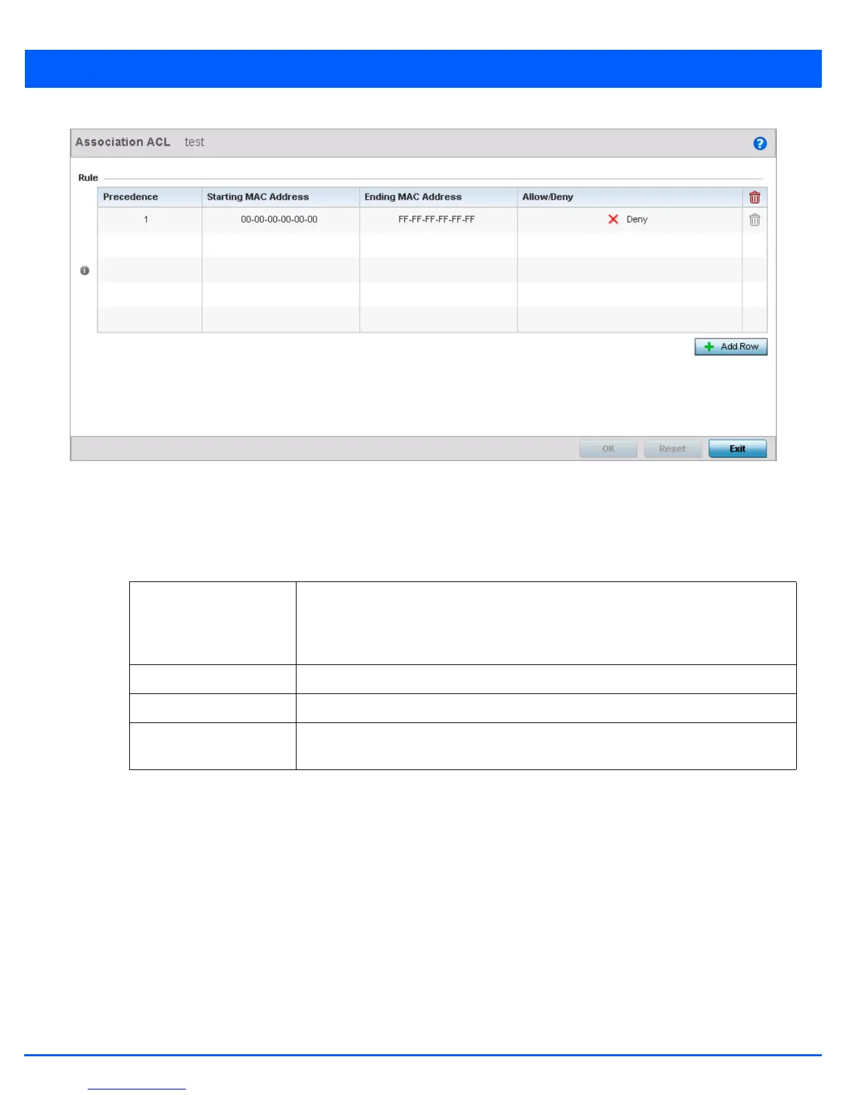 8. Select the + Add Row radio button to add MAC address ranges and allow/deny designations.