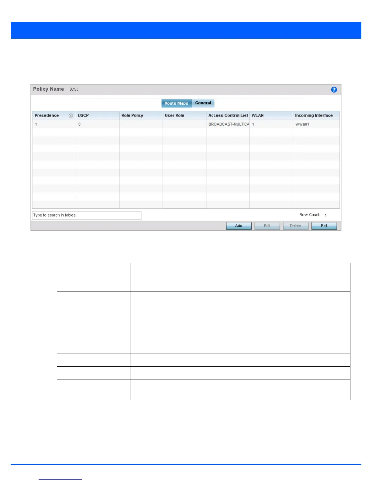 WLAN Displays each policy’s WLAN used as an access/deny filter for the route map.