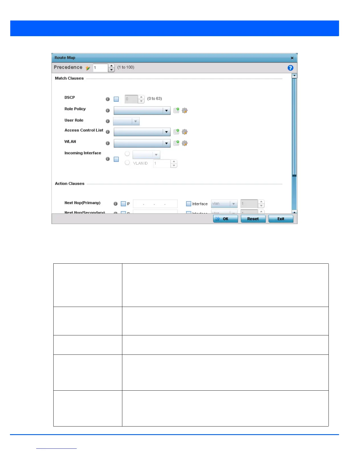 9. Refer to the Match Clauses field to define the following matching criteria for the route-map configuration: