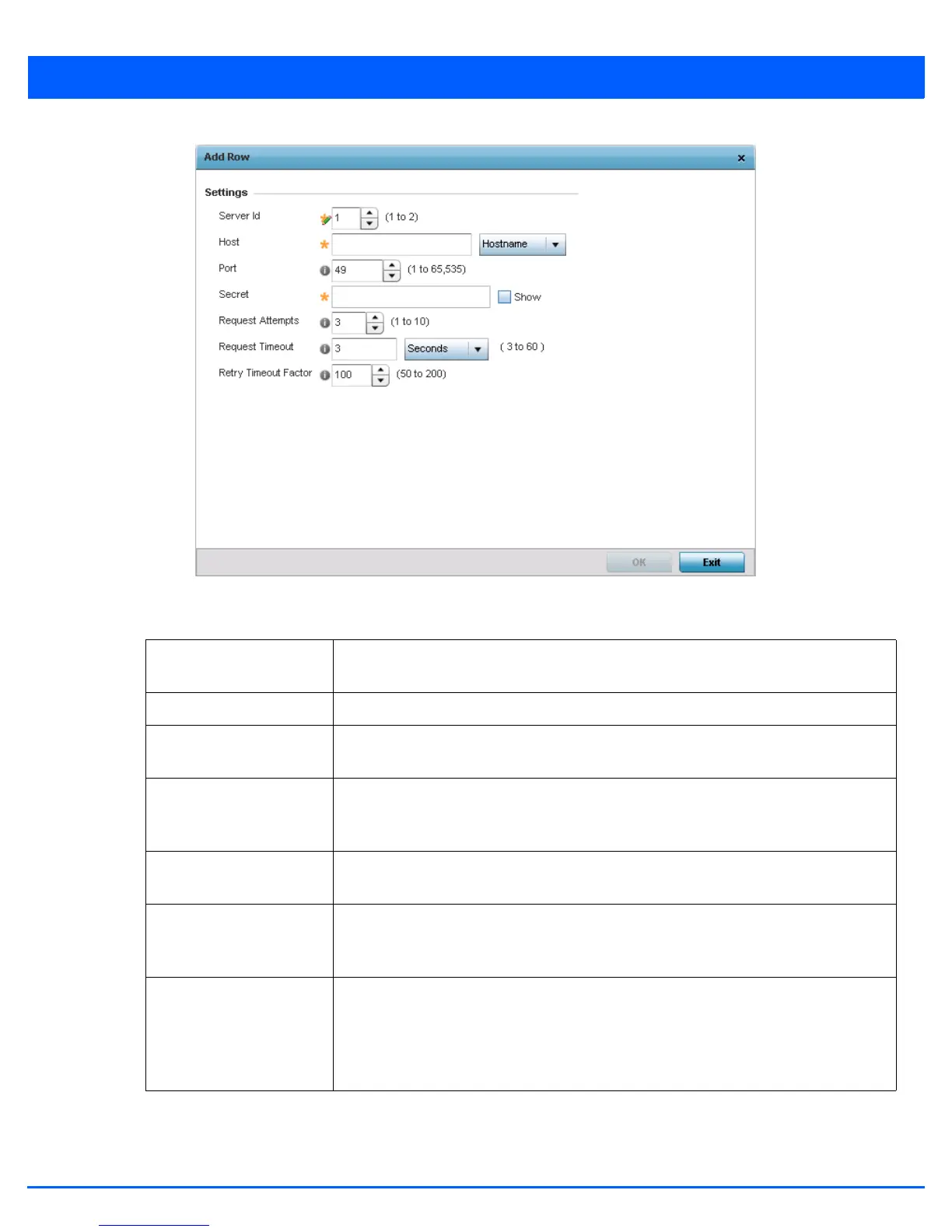 Request Timeout Specify the time for the re-transmission of request packets after an unsuccessful attempt.
