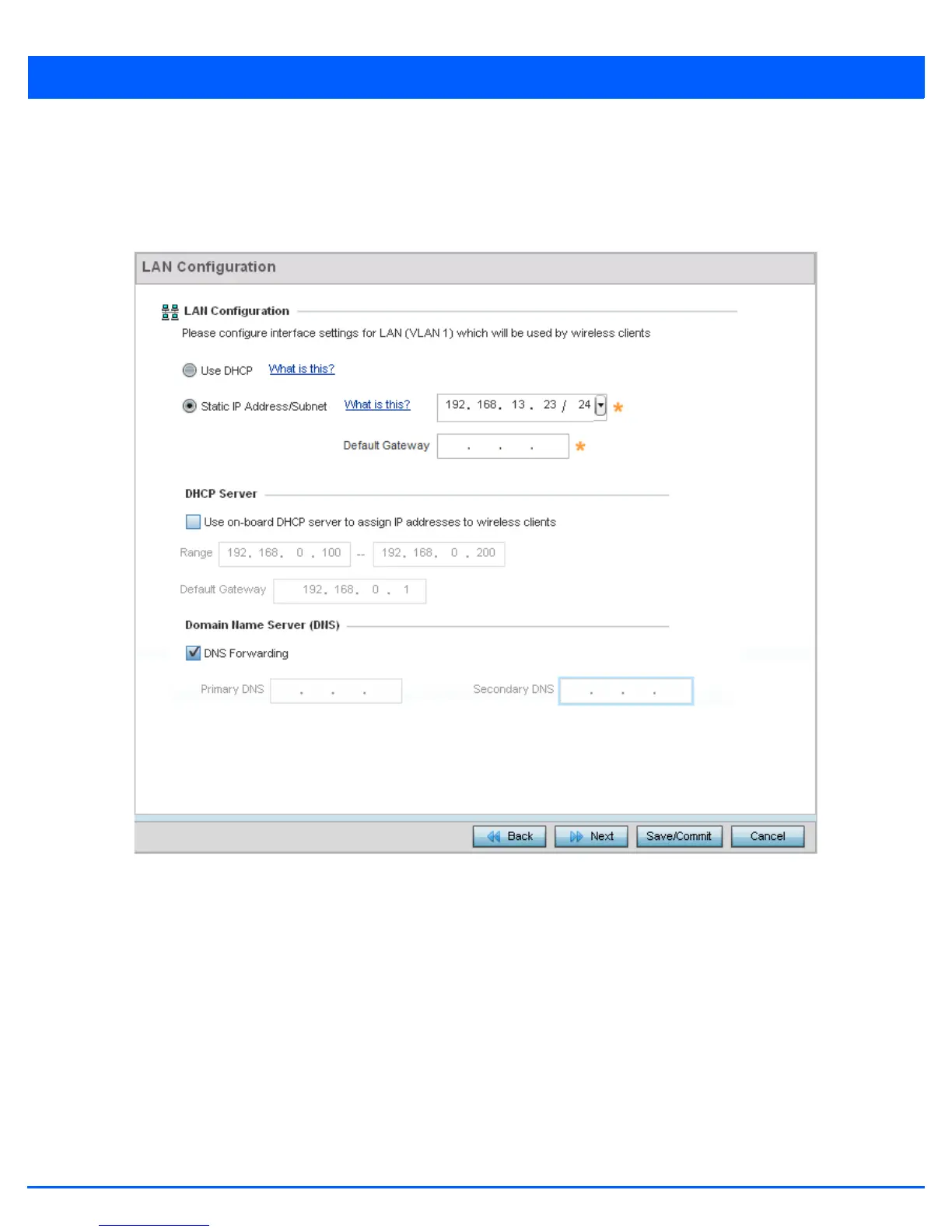 1. Set the following DHCP and Static IP Address/Subnet information for the LAN interface: