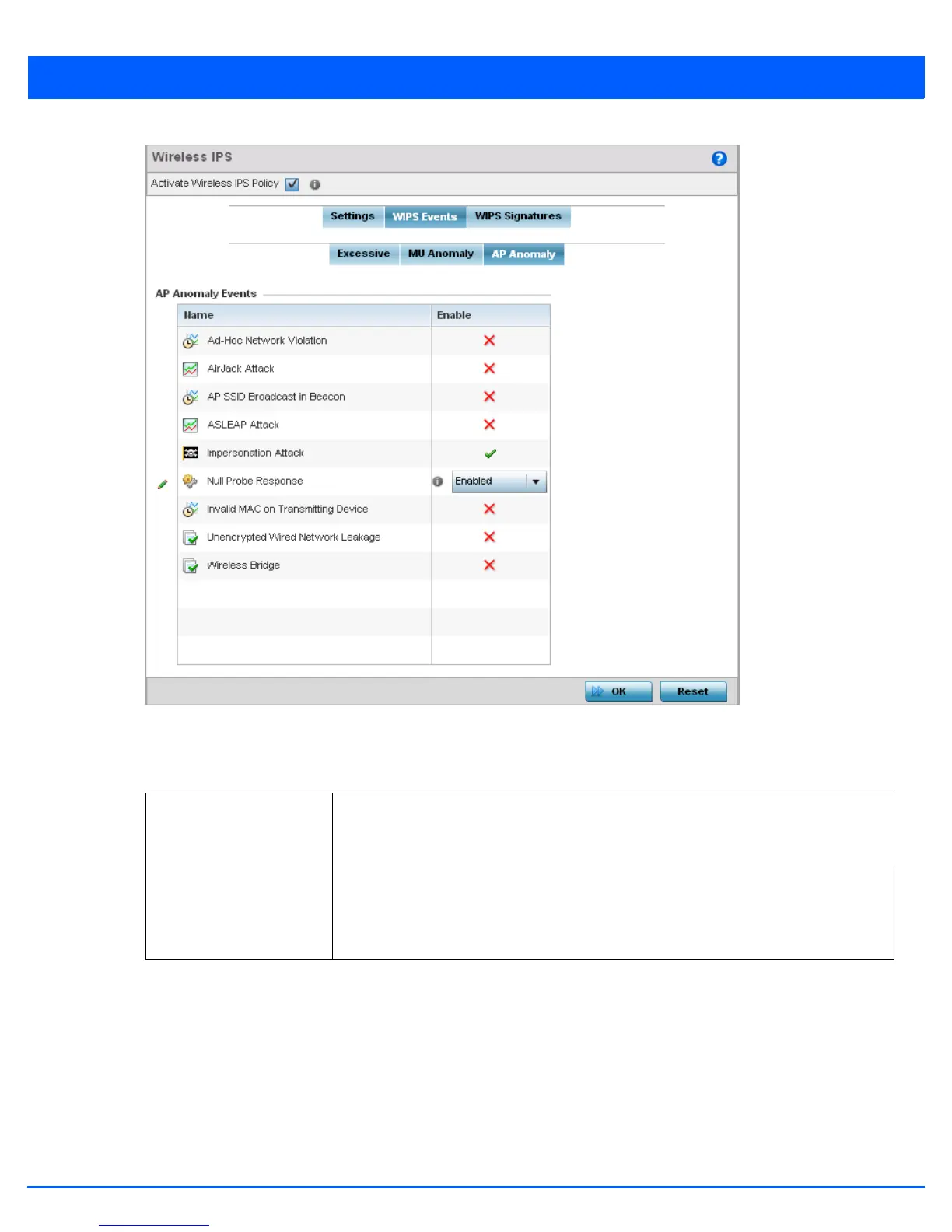 18. Select OK to save the updates to the AP Anomaly configuration used by the WIPS policy. Select Reset to revert to the last