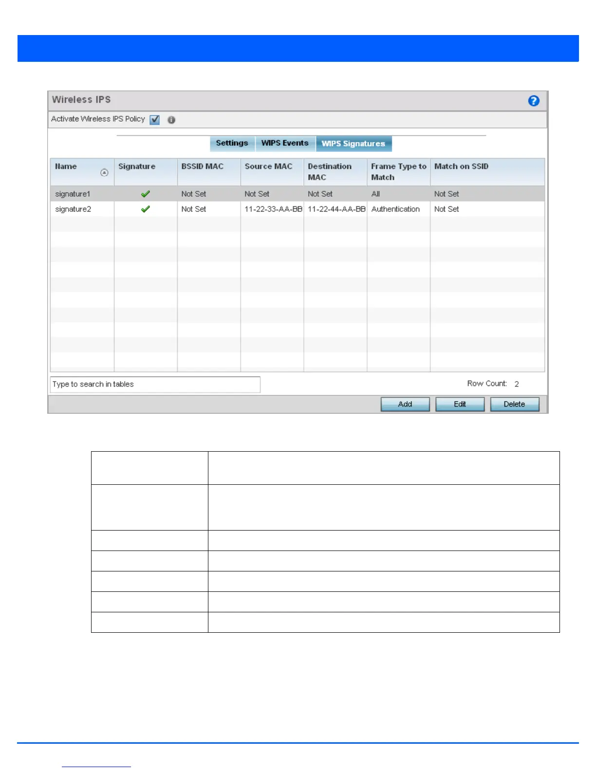 21. Select Add to create a new WIPS signature, Edit to modify the attributes of a selected WIPS signature or Delete to remove