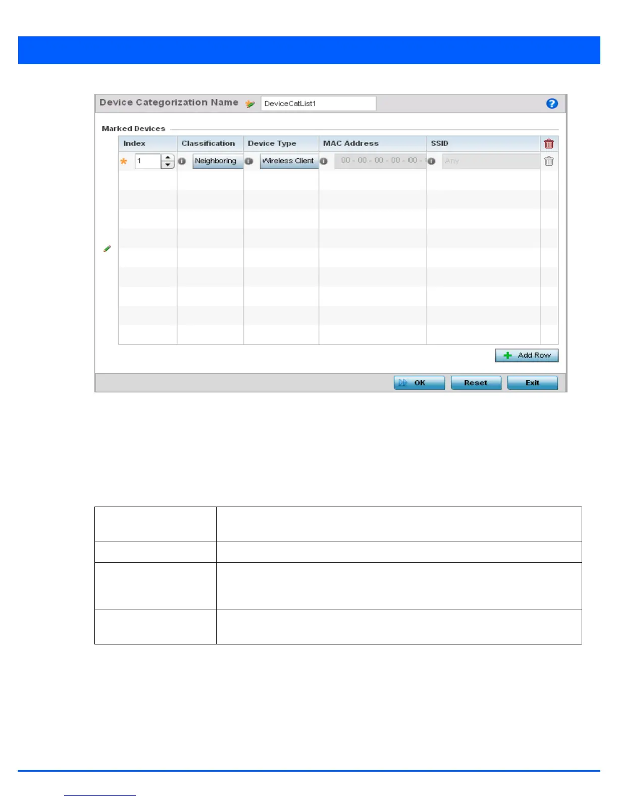 6. Select + Add Row to populate the Marked Devices field with parameters for classifying an access point or client and