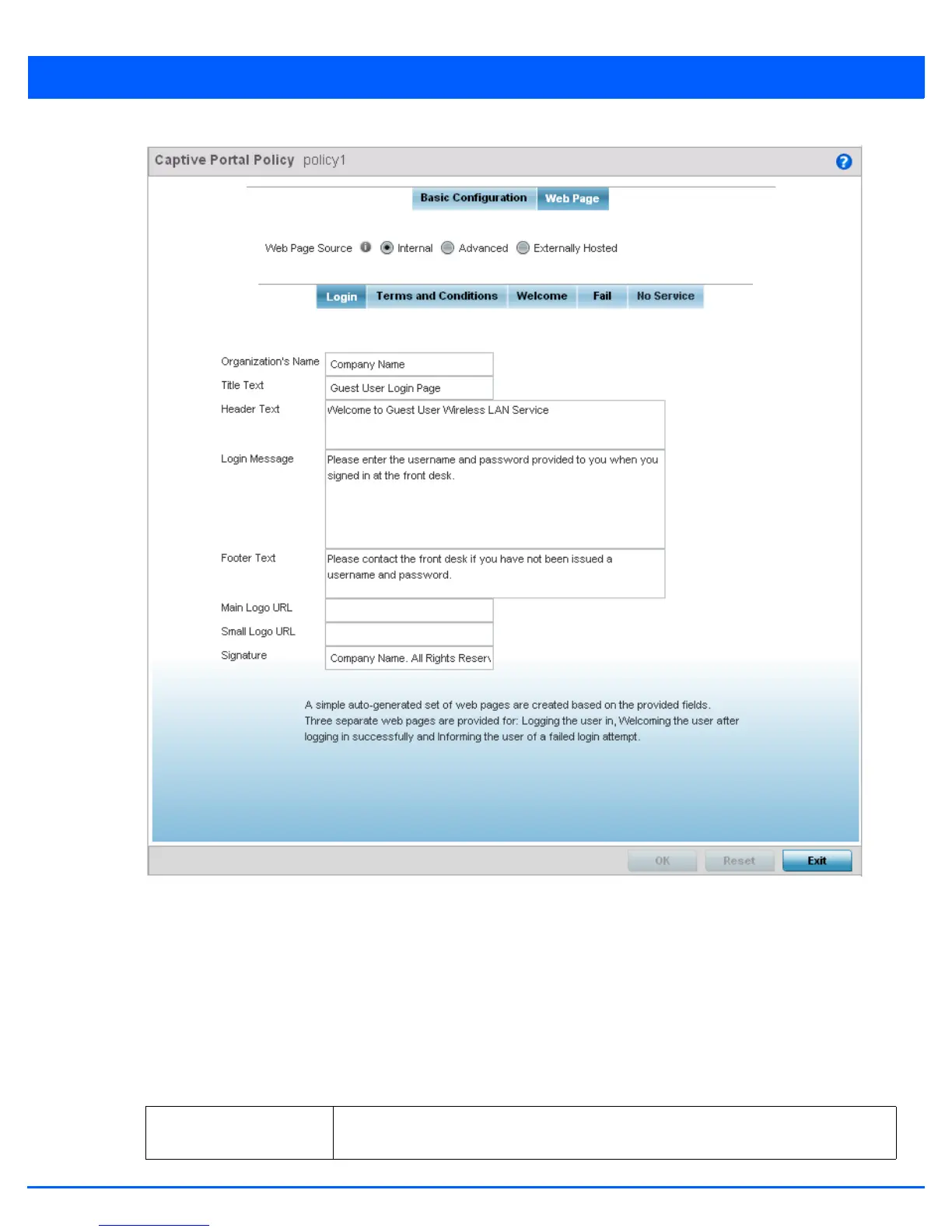 Figure 9-4 Captive Portal Policy screen - Web Page tab
