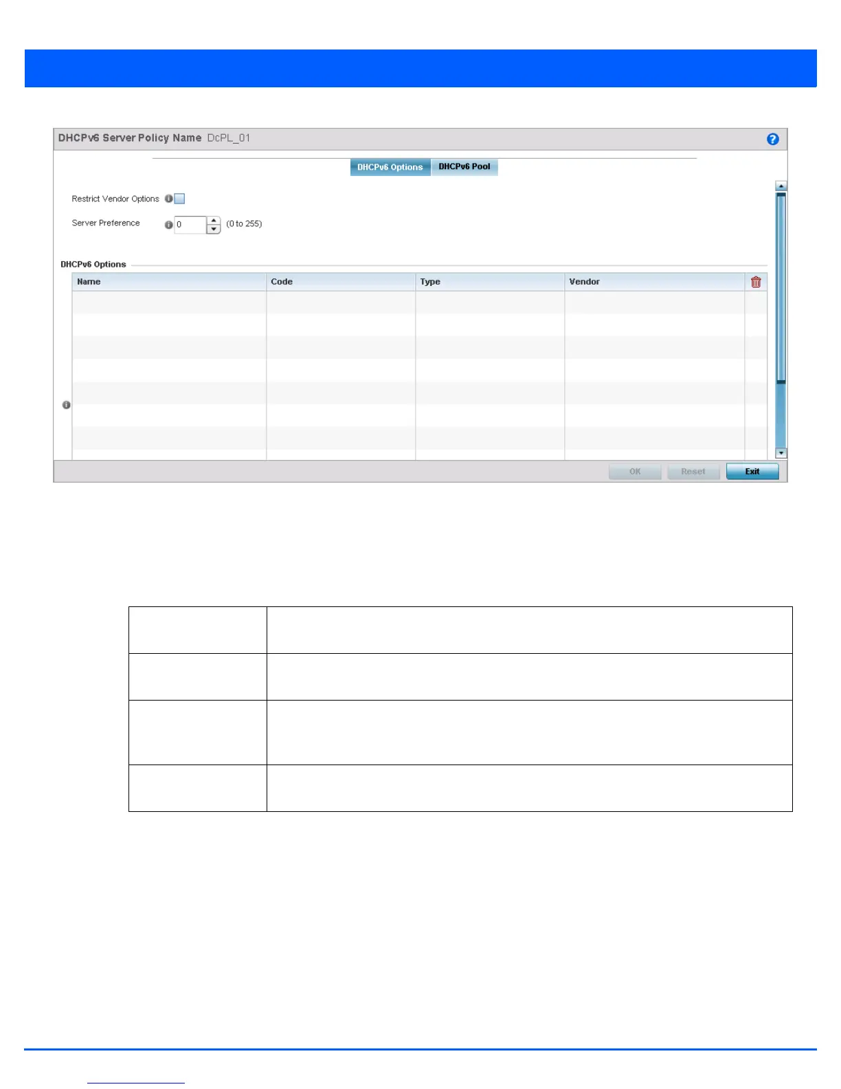 7. Select OK to save the updates to the DHCPv6 options. Select Reset to revert the screen back to its last saved configuration.