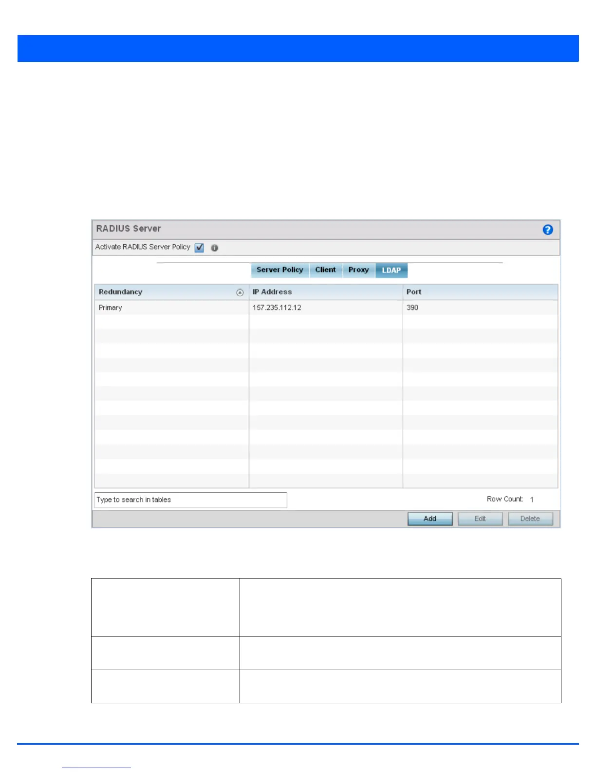 Redundancy Displays whether the listed LDAP server IP address has been defined as a primary
