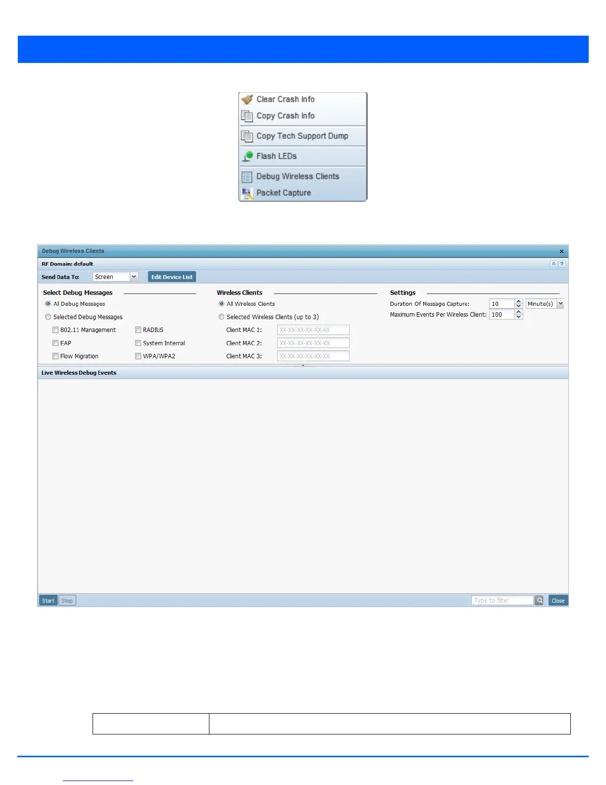 Figure 12-35 Device Browser - Options for Devices - Troubleshooting menu - Debug Wireless Clients screen