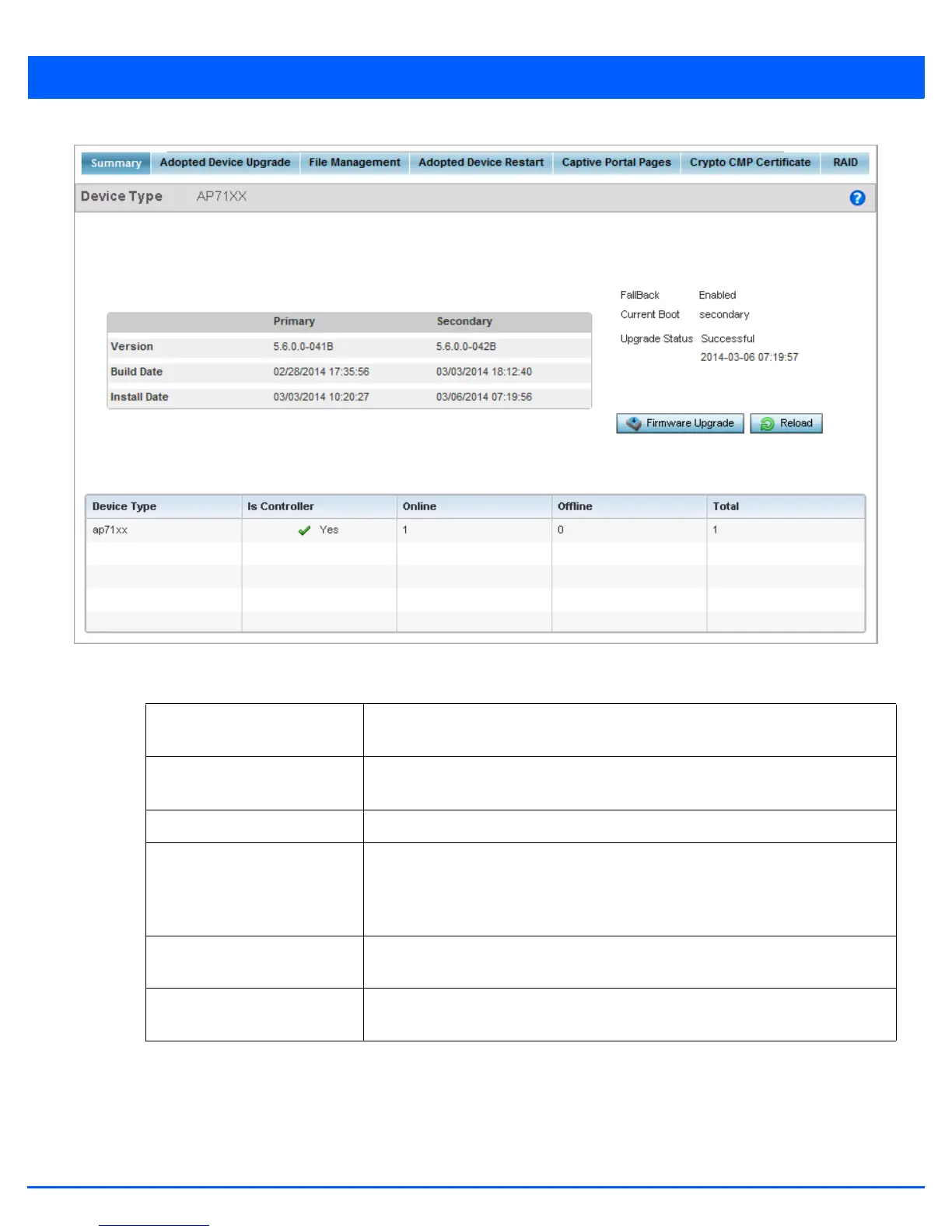Upgrade Status Displays the status of the last firmware upgrade. For information on upgrading device