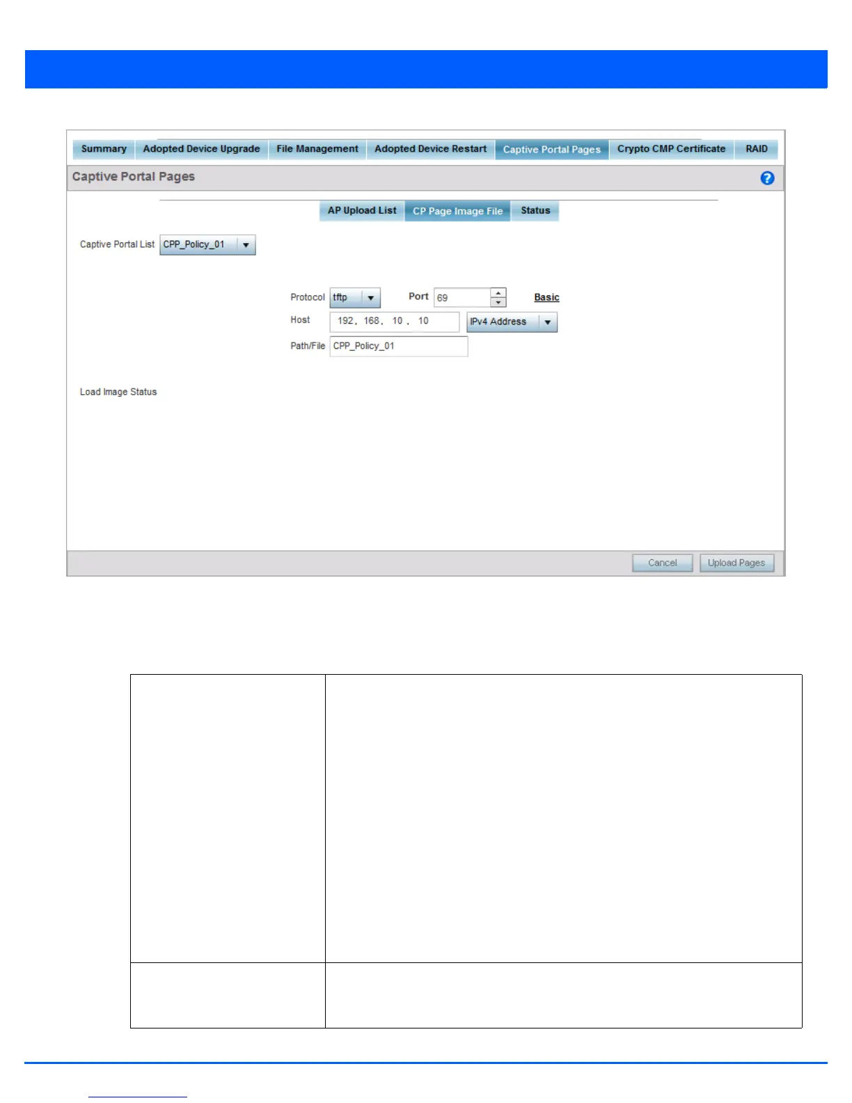 Figure 12-55 Devices Captive Portal Pages - CP Page Image File screen