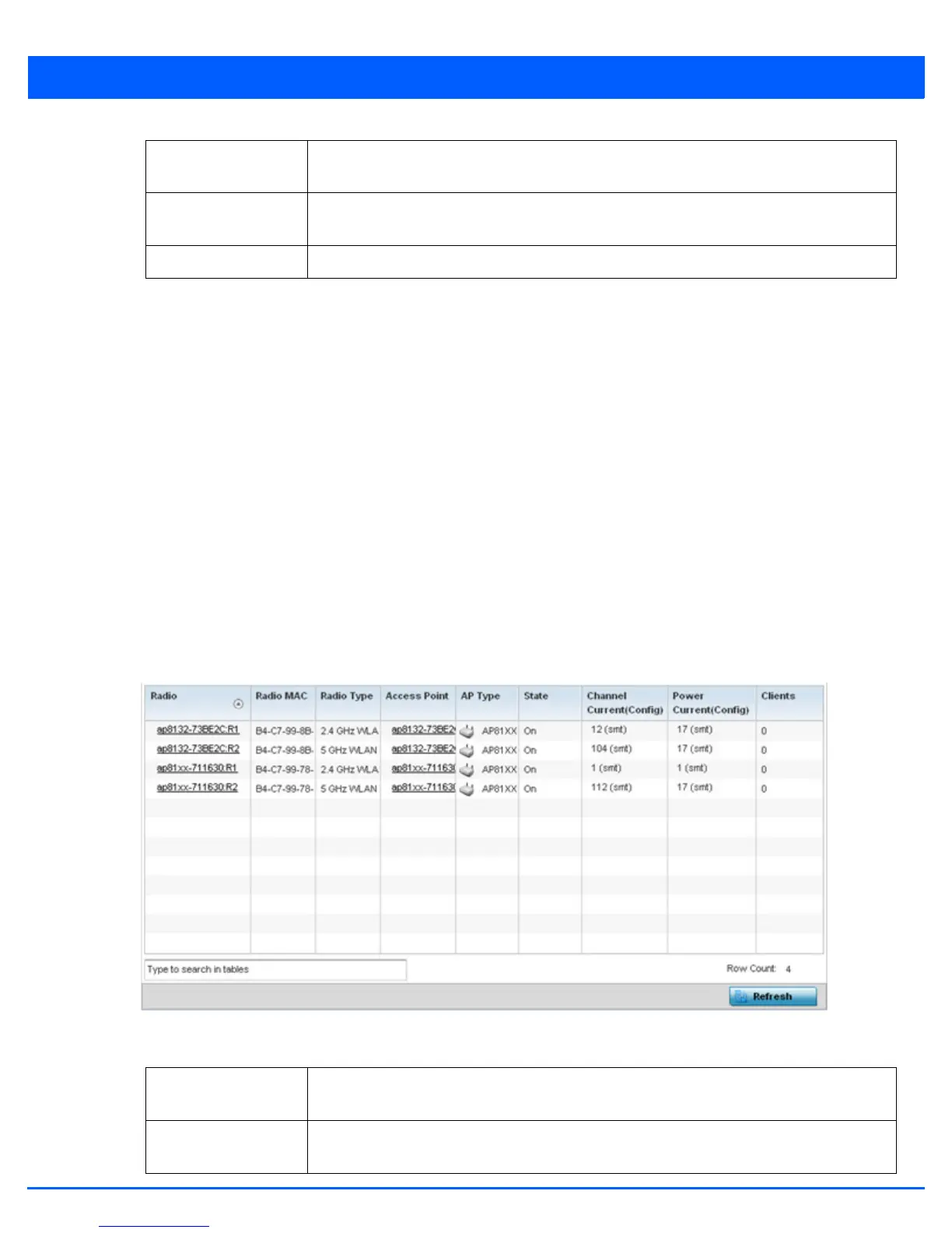 The Radio screens displays information on RF Domain member access point radios. Use these screens to troubleshooting radio