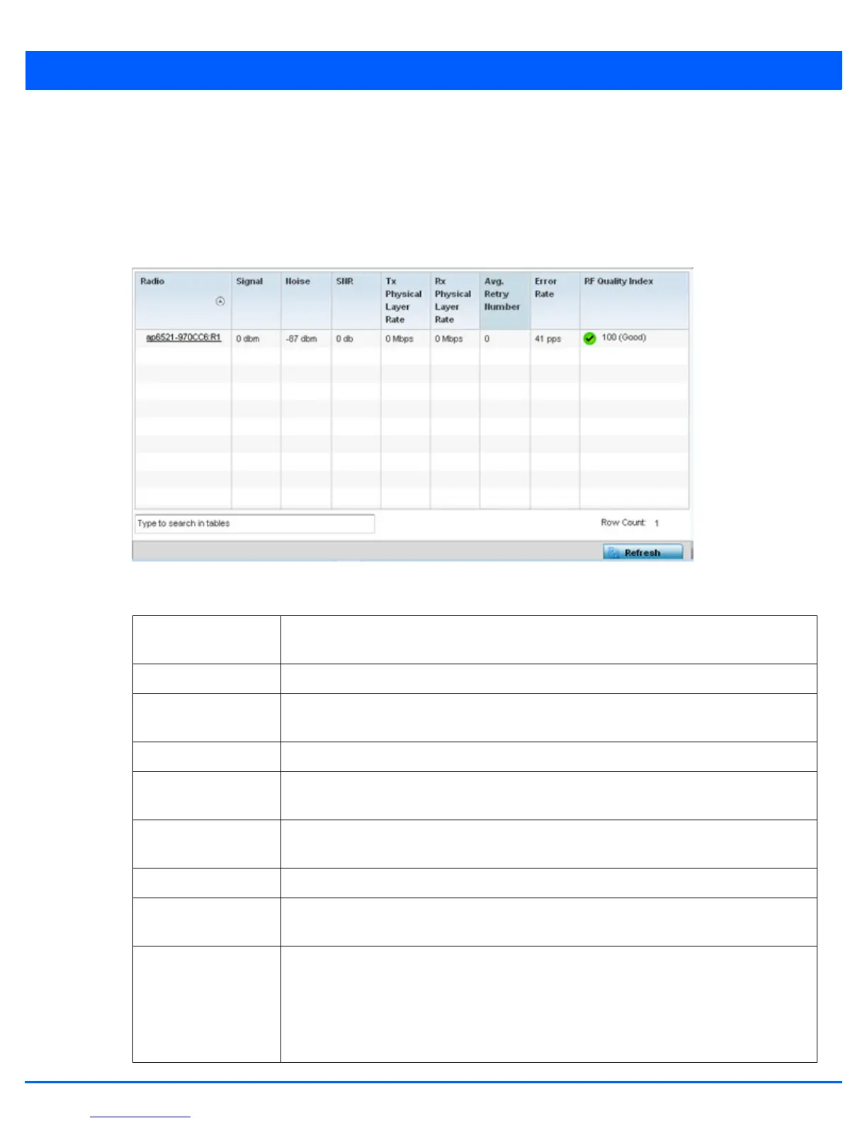 RF Quality Index Displays an integer (and performance icon) that indicates the overall RF performance for each