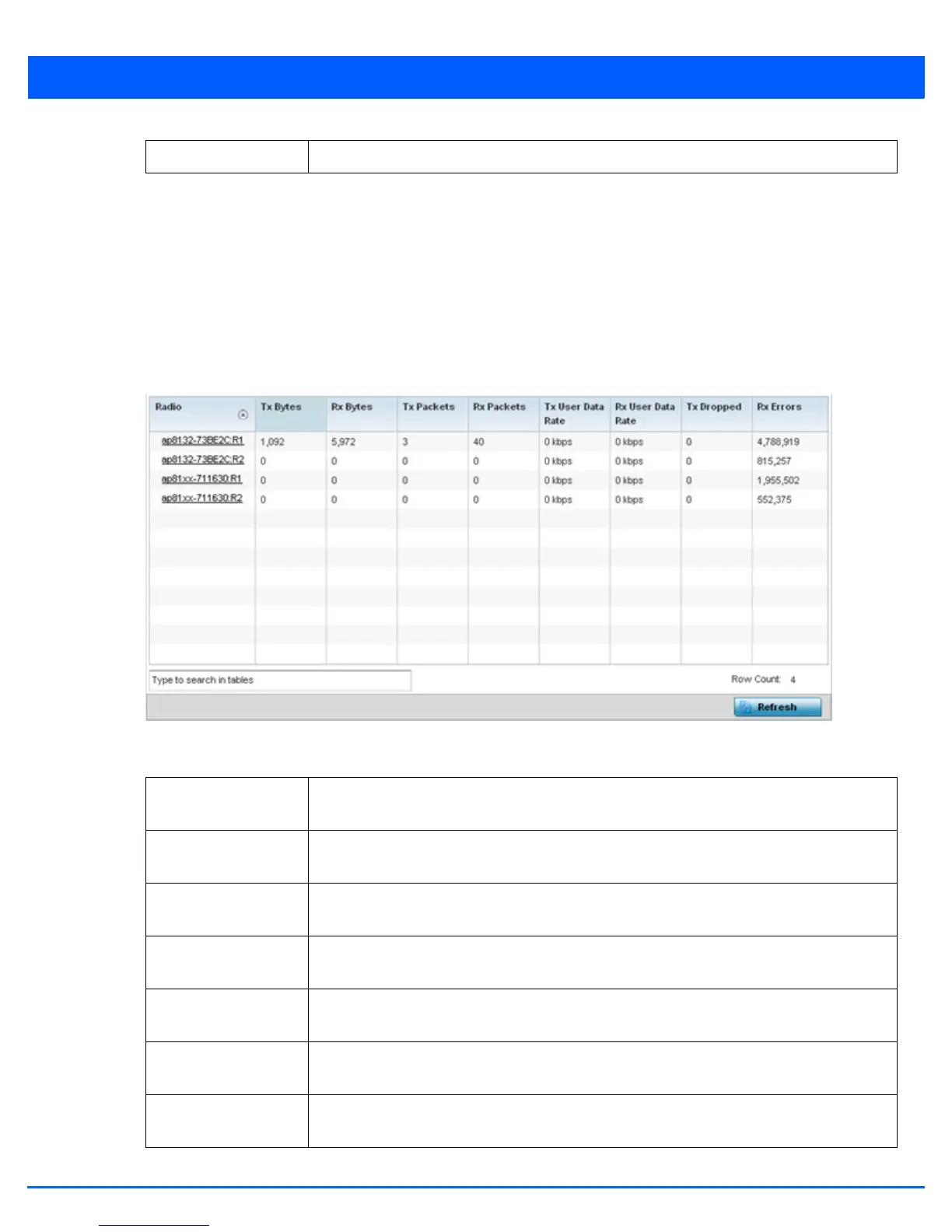 Rx Bytes Displays the total number of bytes received by each RF Domain member access point radio.