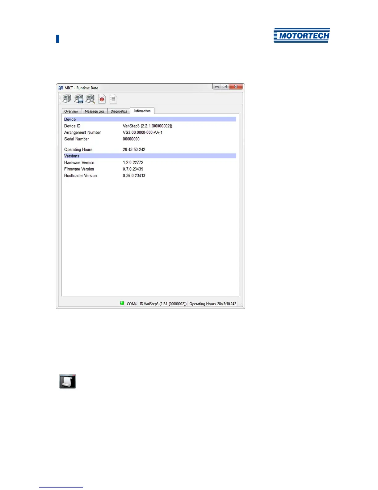 current runtime data or, in case of problems, send them to the MOTORTECH Service Department