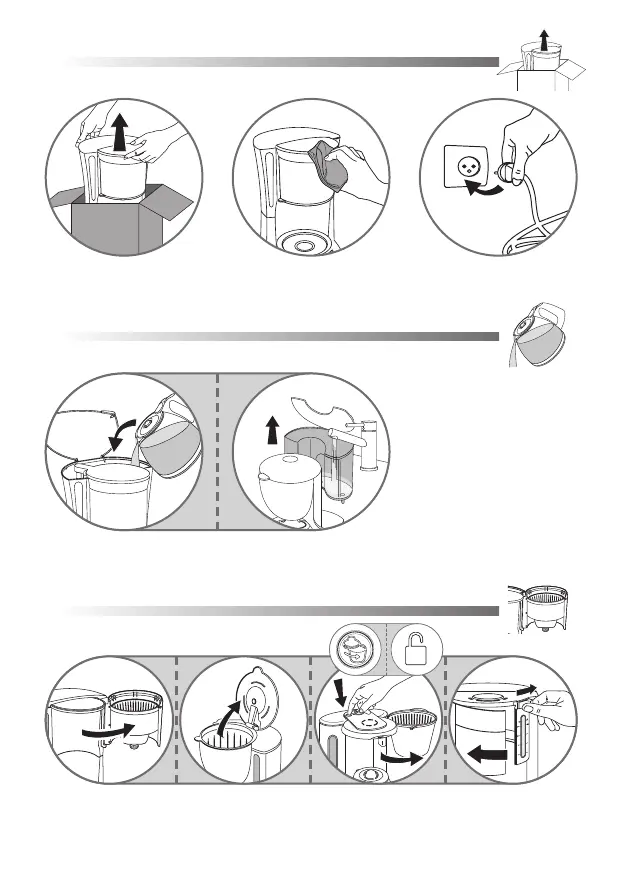 Moulinex Subito FG360D - Brewing Process - Steps 1-3; Figure 1: Initial Assembly; Figure 2: Water and Coffee Preparation; Figure 3: Starting the Brew Cycle