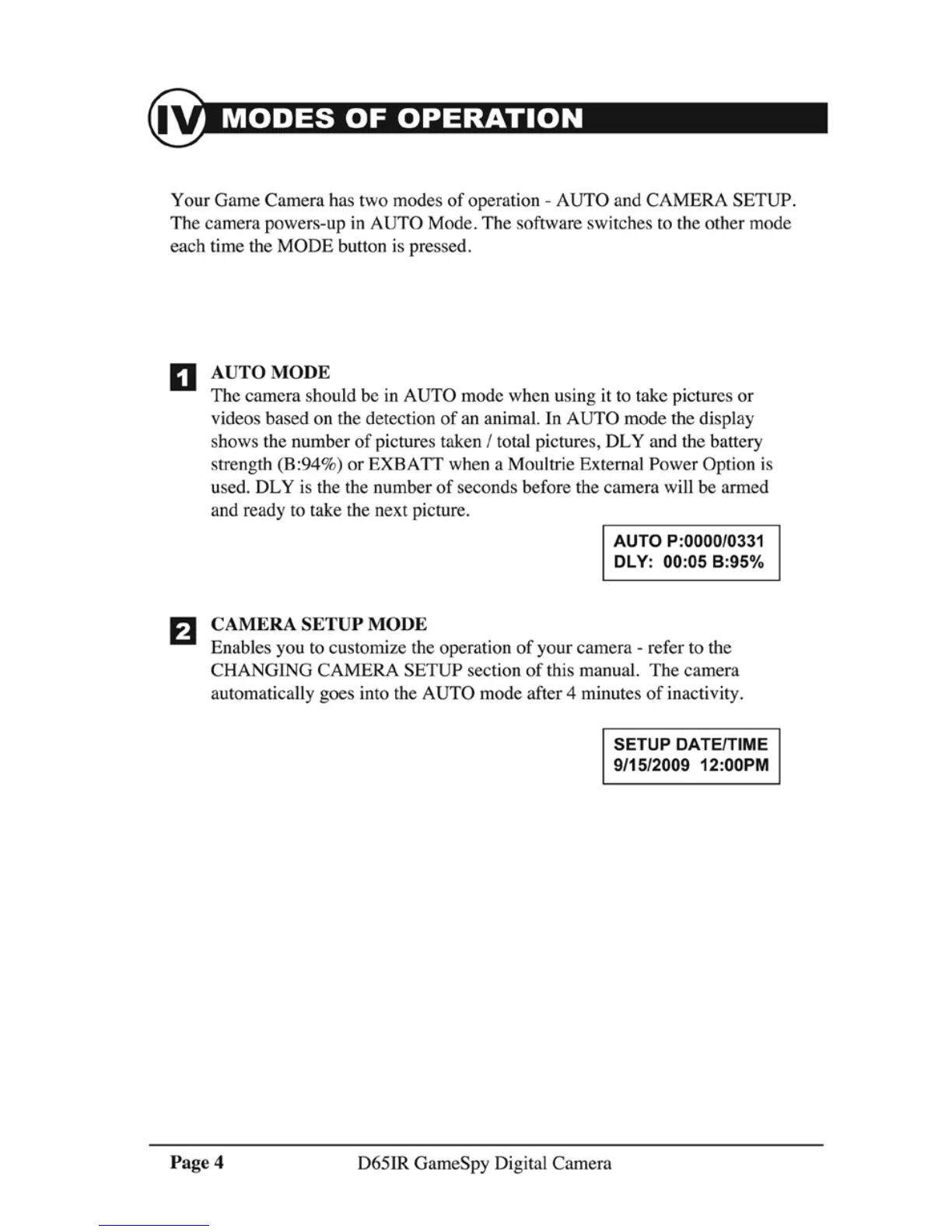 Moultrie D65IR - MODES OF OPERATION; AUTO MODE; CAMERA SETUP MODE