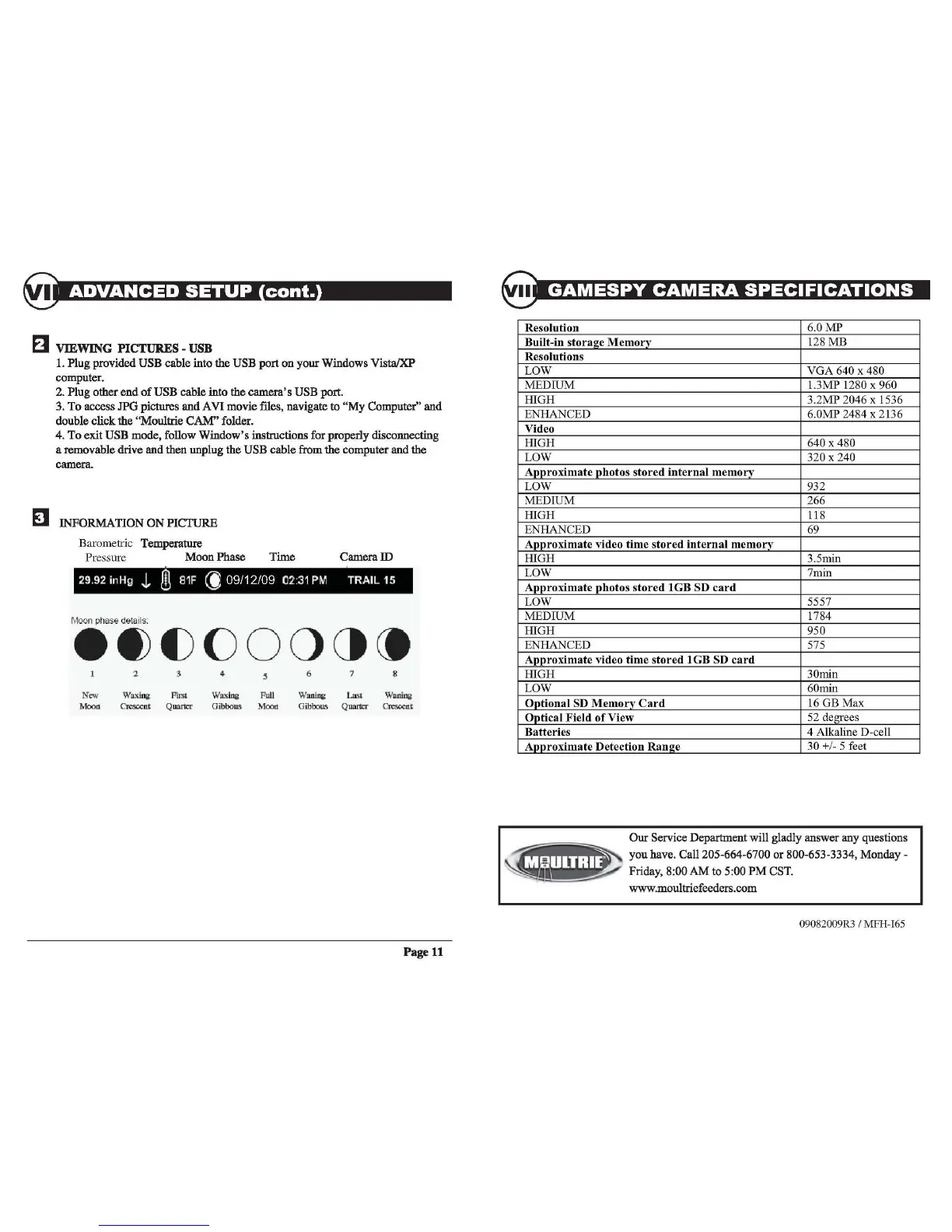 Moultrie GAMESPY I65 - Viewing Pictures - USB; Gamespy Camera Specifications; Information on Picture; Advanced Setup