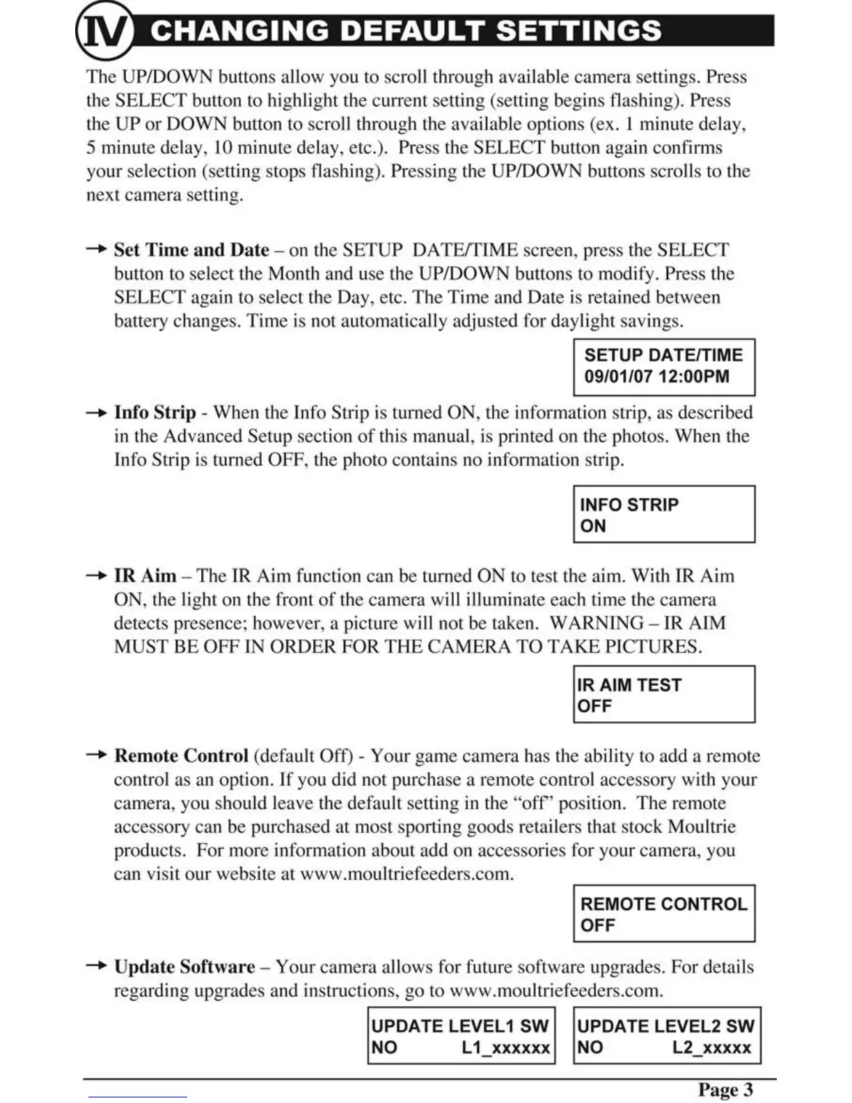 Moultrie M40 - Changing Default Settings; Set Time and Date; Info Strip Configuration; IR Aim Function