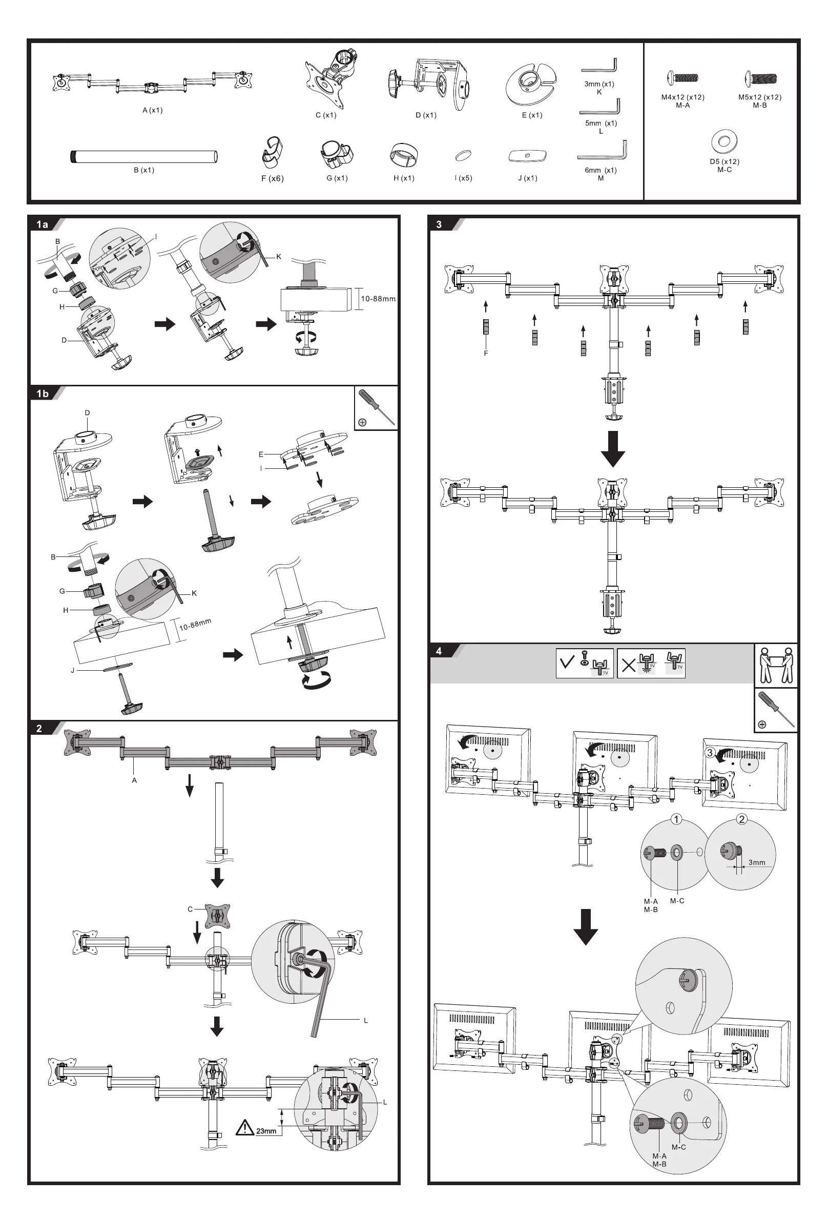 Mount-It! MI-1753 - Part Identification; Assembly: Base and Pole Attachment; Assembly: Arm Attachment to Pole; Assembly: Monitor Mounting
