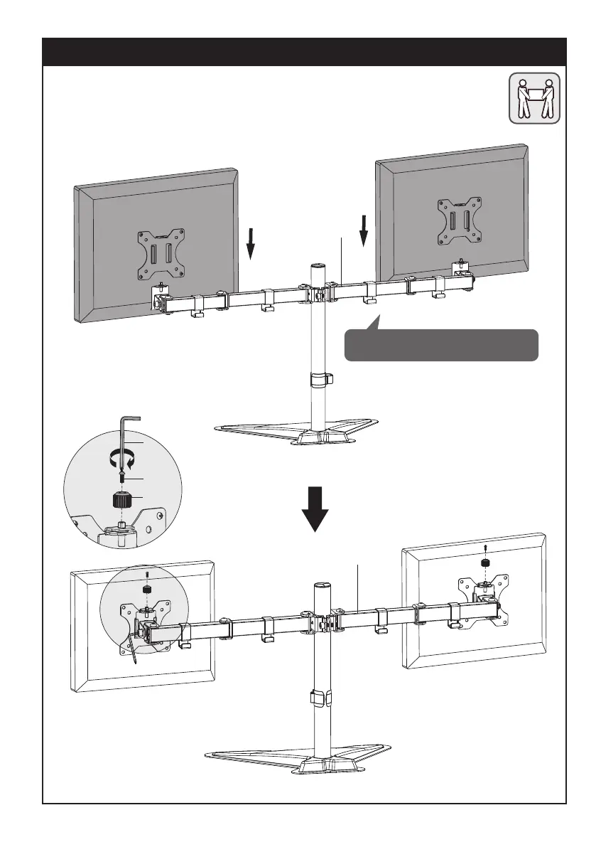 Slide the monitor onto the head of swivel arm (B). Install the plastic cover (H) and security bolt (I).