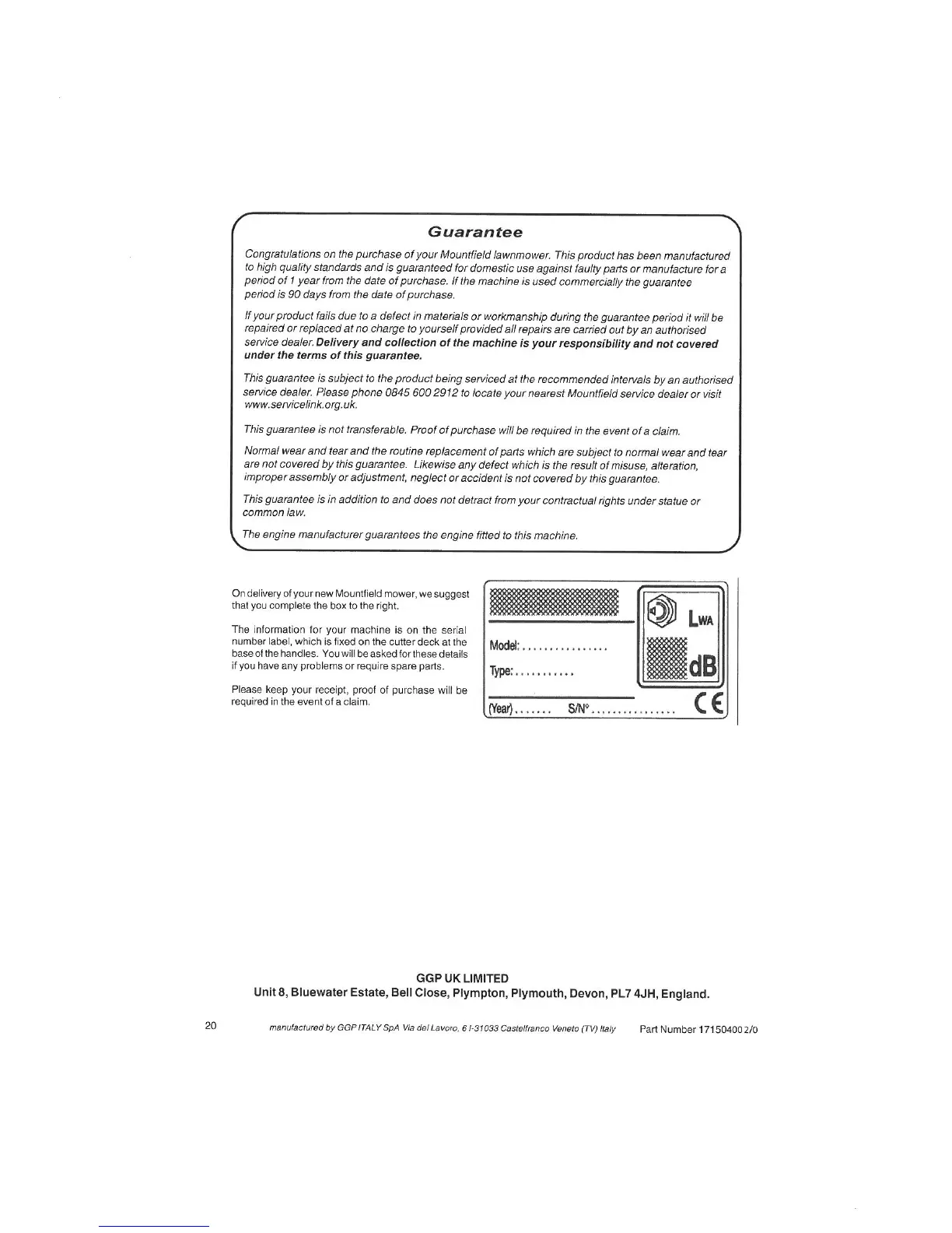Mountfield HP180 - Guarantee Information; Product Guarantee Terms