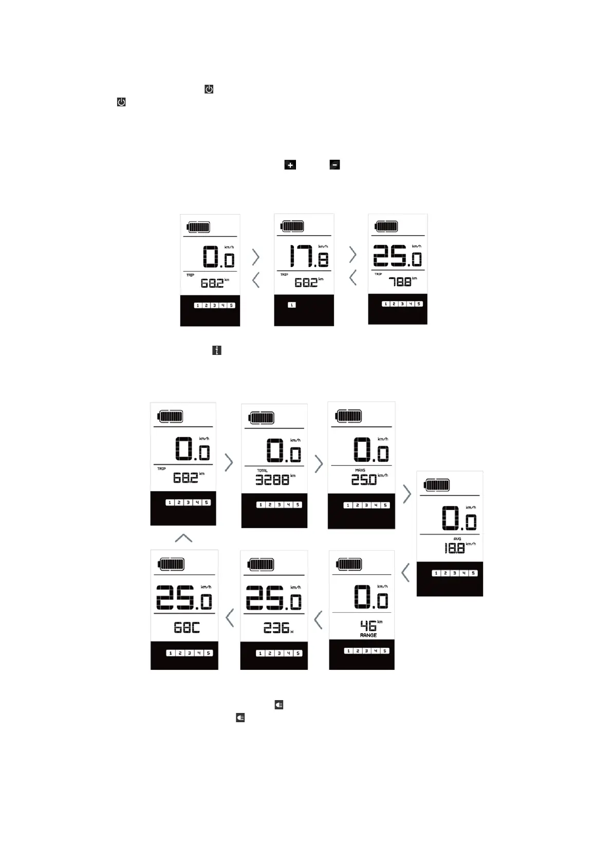 Po zapnutí displeja krátko stlačte tlačidlá alebo a nastavte požadovanú úroveň motorovej