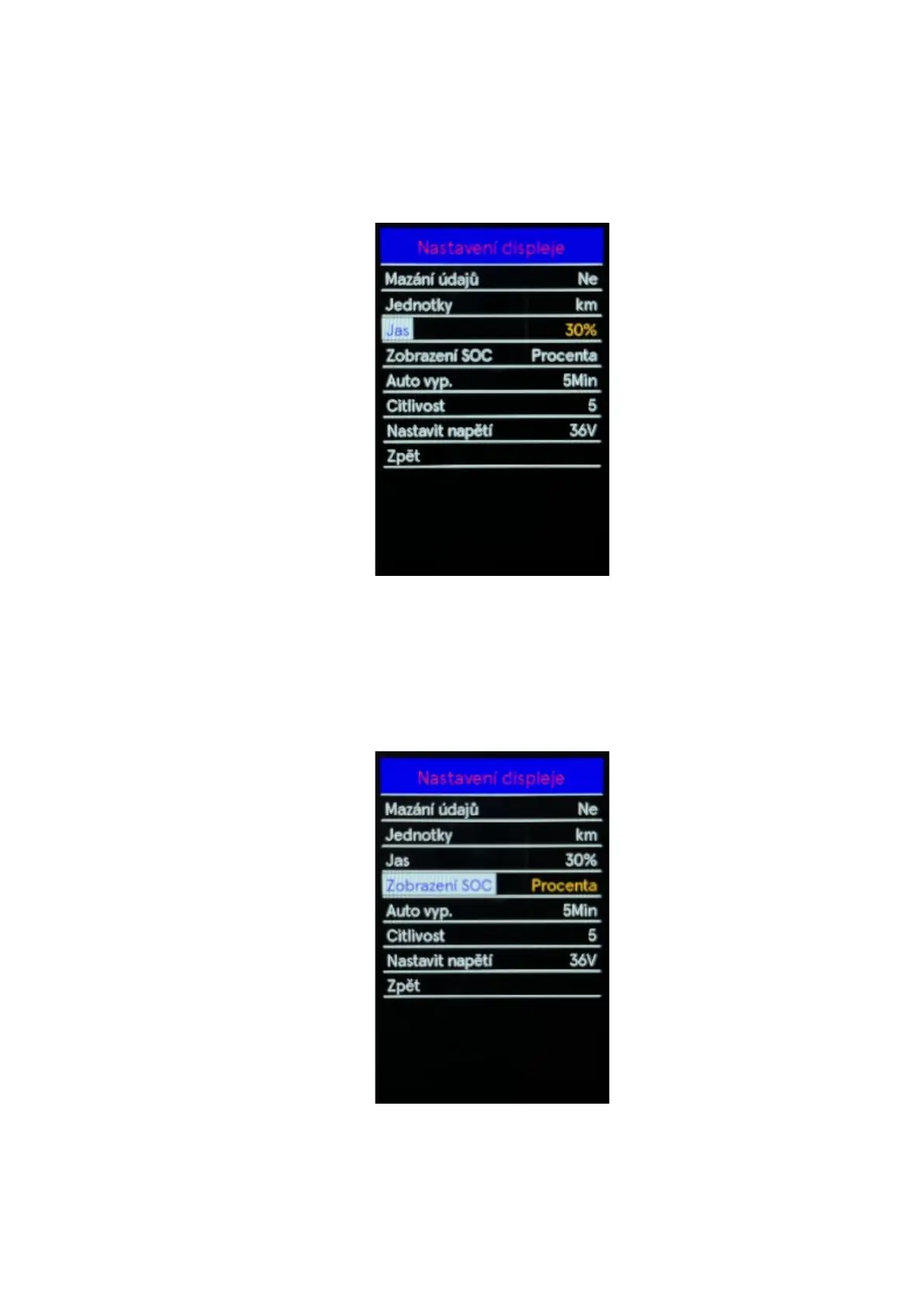 Use the "+" or "-" buttons to select the Brightness, by pressing the "i" button confirm the option and