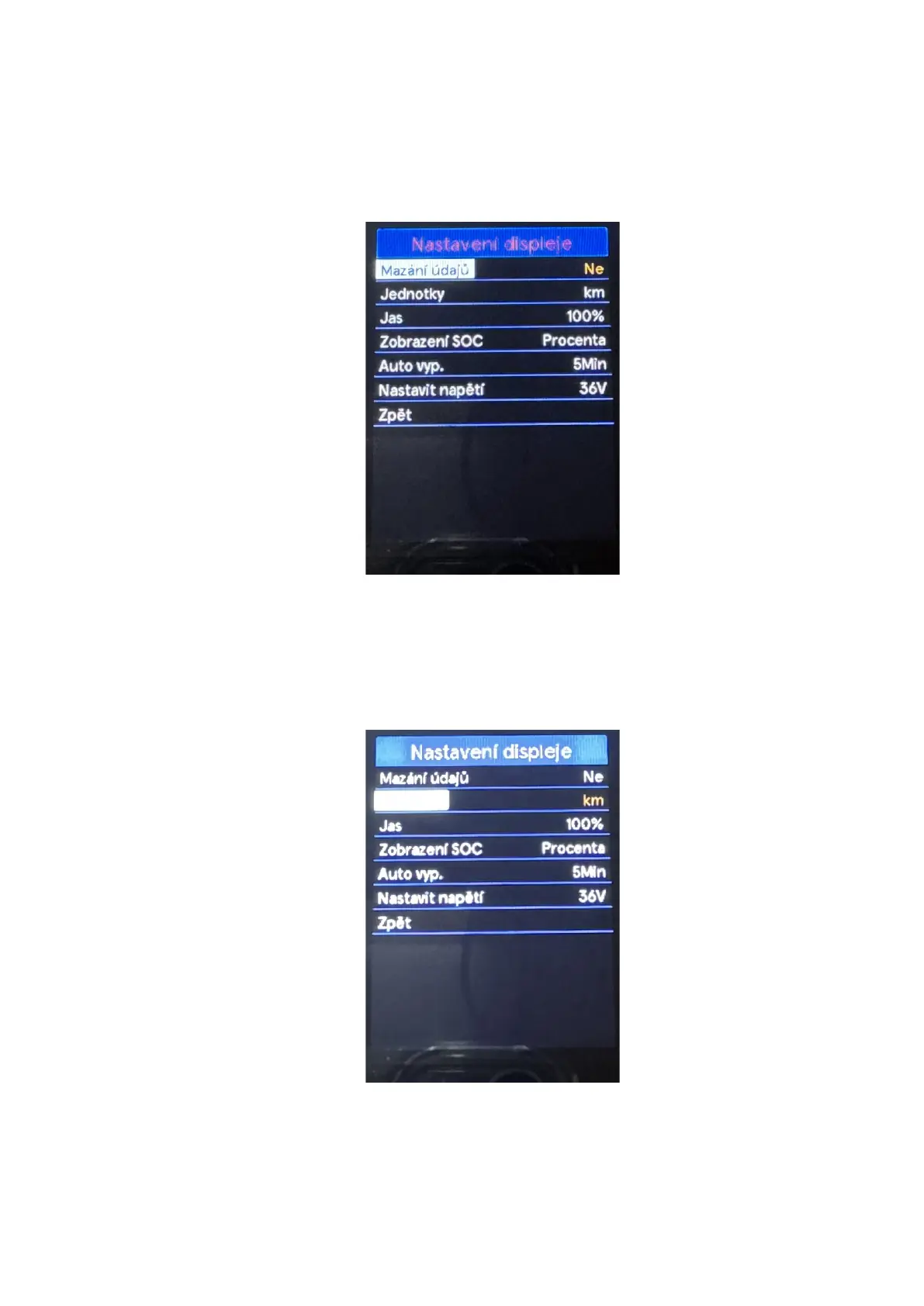 Pomocí tlačítek „+“ nebo „-“ vyberte nabídku Jednotky. Stisknutím tlačítka „i“ možnost potvrdíte a