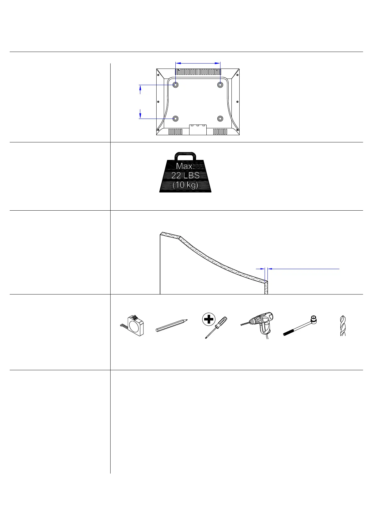 ● The wall must be capable of supporting five times the weight of the TV and mount