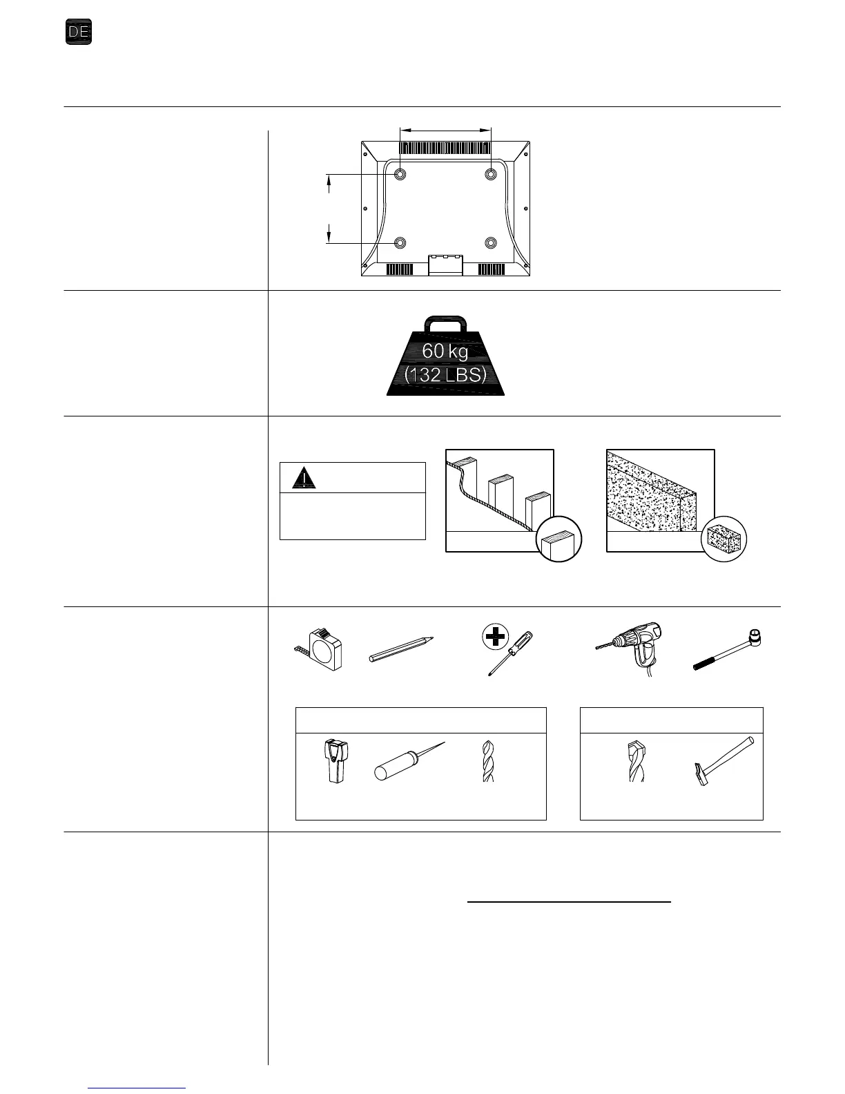 ● Die Wand muss das Fünffache des Gesamtgewichts des Fernsehapparats und der Halterung